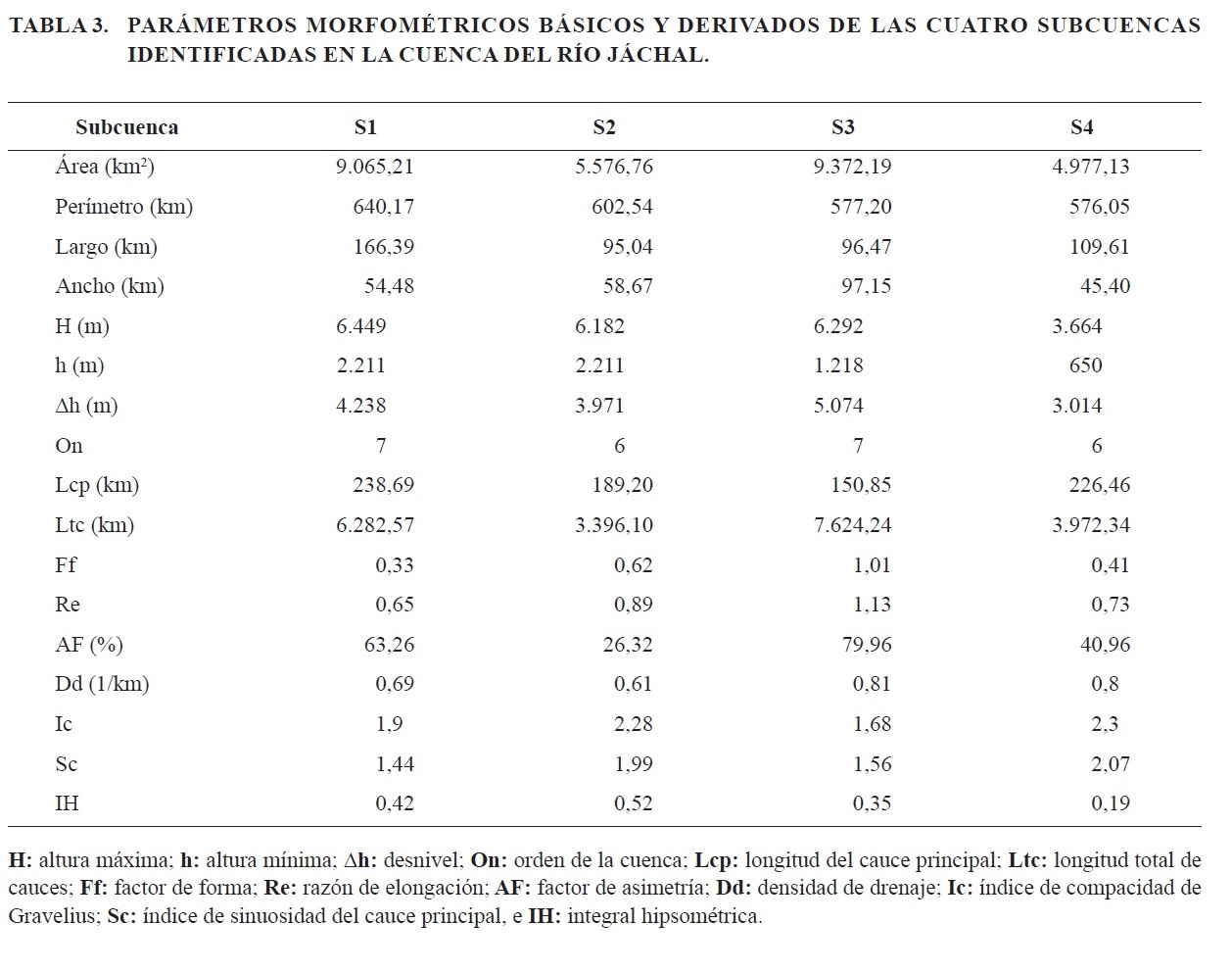 Los parámetros morfométricos básicos y derivados obtenidos para cada una de estas cuatro subcuencas se muestran en la tabla 3 y son especificados a continuación: