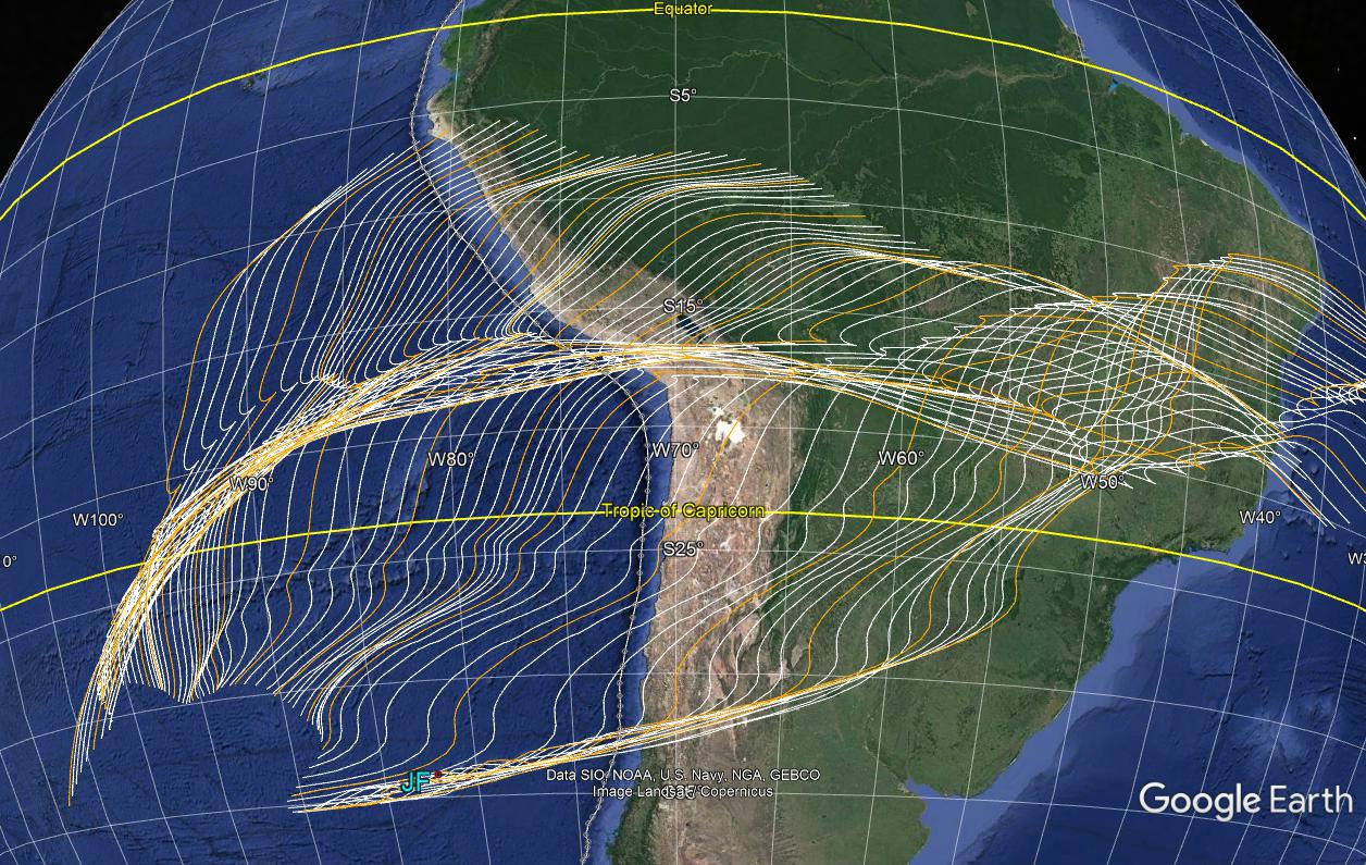 From the composite model, the calculated JF and EN hotspot traces on the Nazca plate were again reconstructed relative to the South American plate back to 80 Ma, at 1 Myr increments(Fig. 3, with 5 Myr increments highlighted). The traces are not conformed to an inferred three-dimensional subduction zone configuration in either map views or graphical sections.