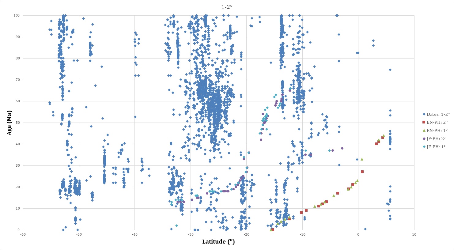 The author updated and expanded the compilation of radiometric dates from Andean igneous rocks providing for comparison with plate-to-plate and plate-hotspot reconstructions. The dataset, which incorporates previous regional compilations as well as numerous original publications, is particularly focused on the Andean crest from northern Peru to southern Chile and along the foreland from Peru through Bolivia and Argentina. Maps at 10 Myr intervals, 0-80 Ma, are provided in the Supplementary Data, along with a Supplementary File for display in Google Earth. For this study, sections parallel with the oceanic trench display the radiometric data projected normal to the sections. Figure 4 portrays the dates in two stacked views, in age versus latitude, for 0-100 Ma and 10° N to 60° S. Figures 5 and 6 are graphs of age versus latitude for 1° longitude segments together with reconstructed loci intersections.