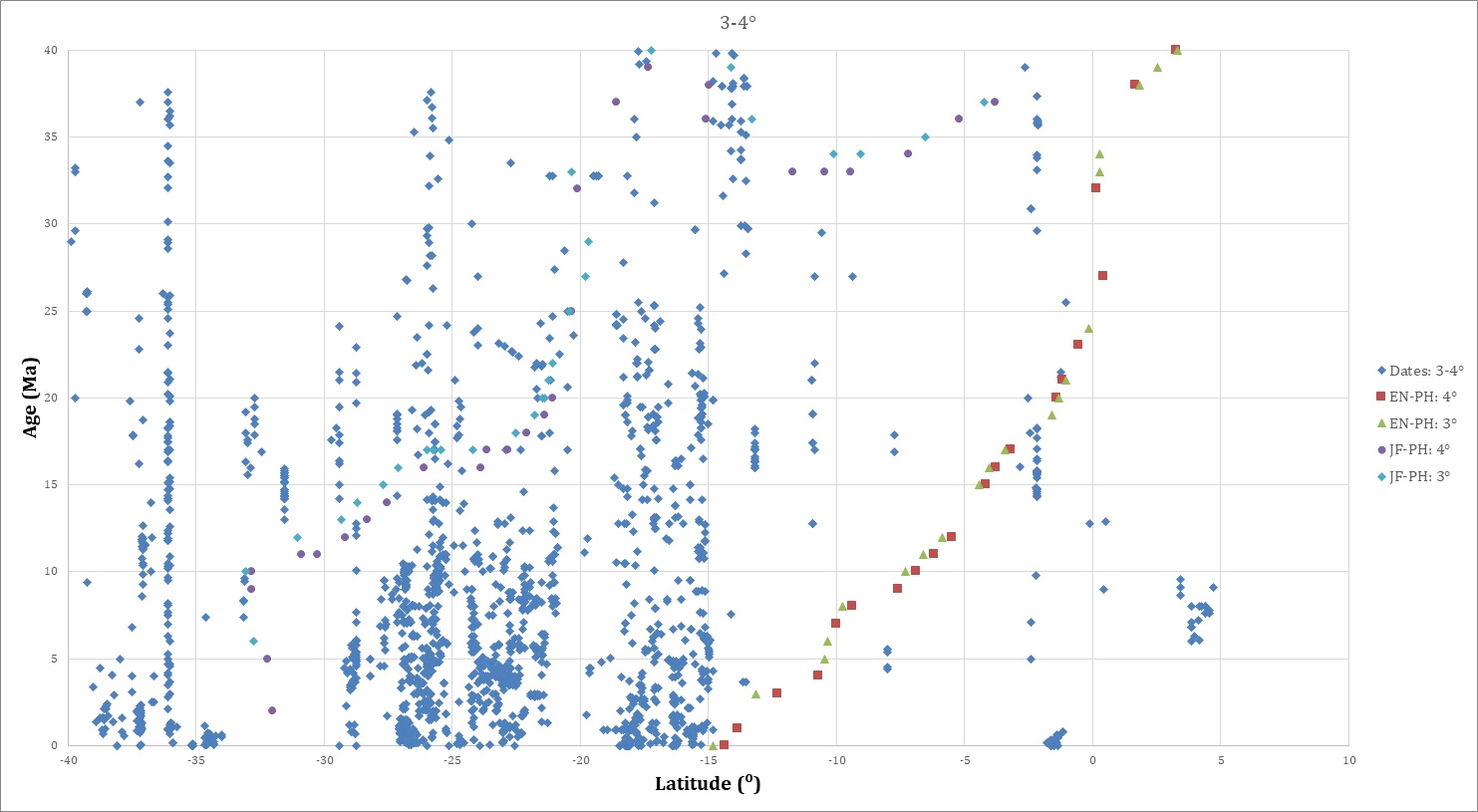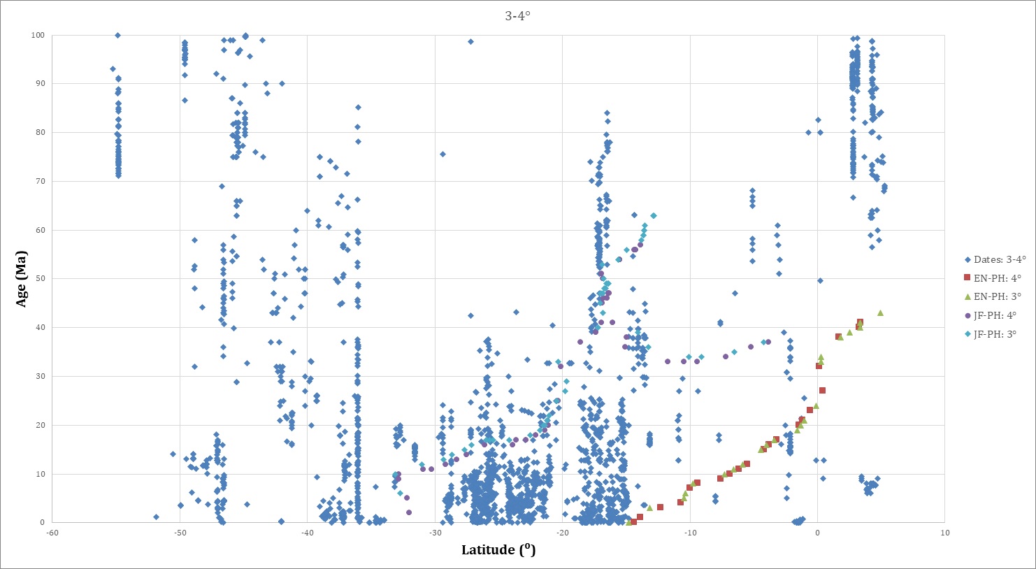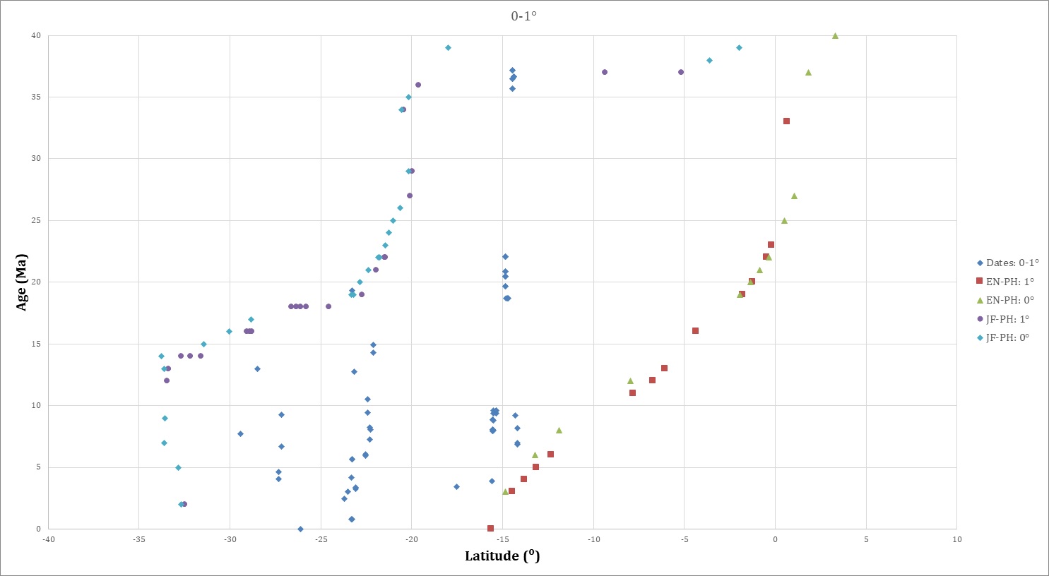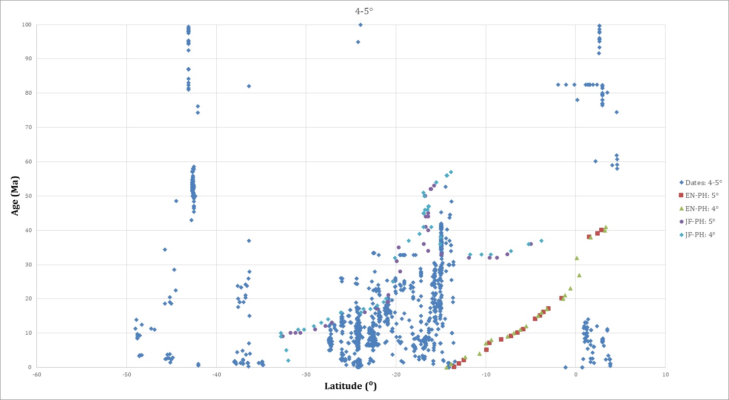 In figure 4, all isotopic dates <80 Ma are projected onto a graph of age versus latitude arranged by longitudinal distance from the trench. The dates farthest from the trench are progressively “on top” of dates closer to the trench in figure 4A, and viceversa in figure 4B.