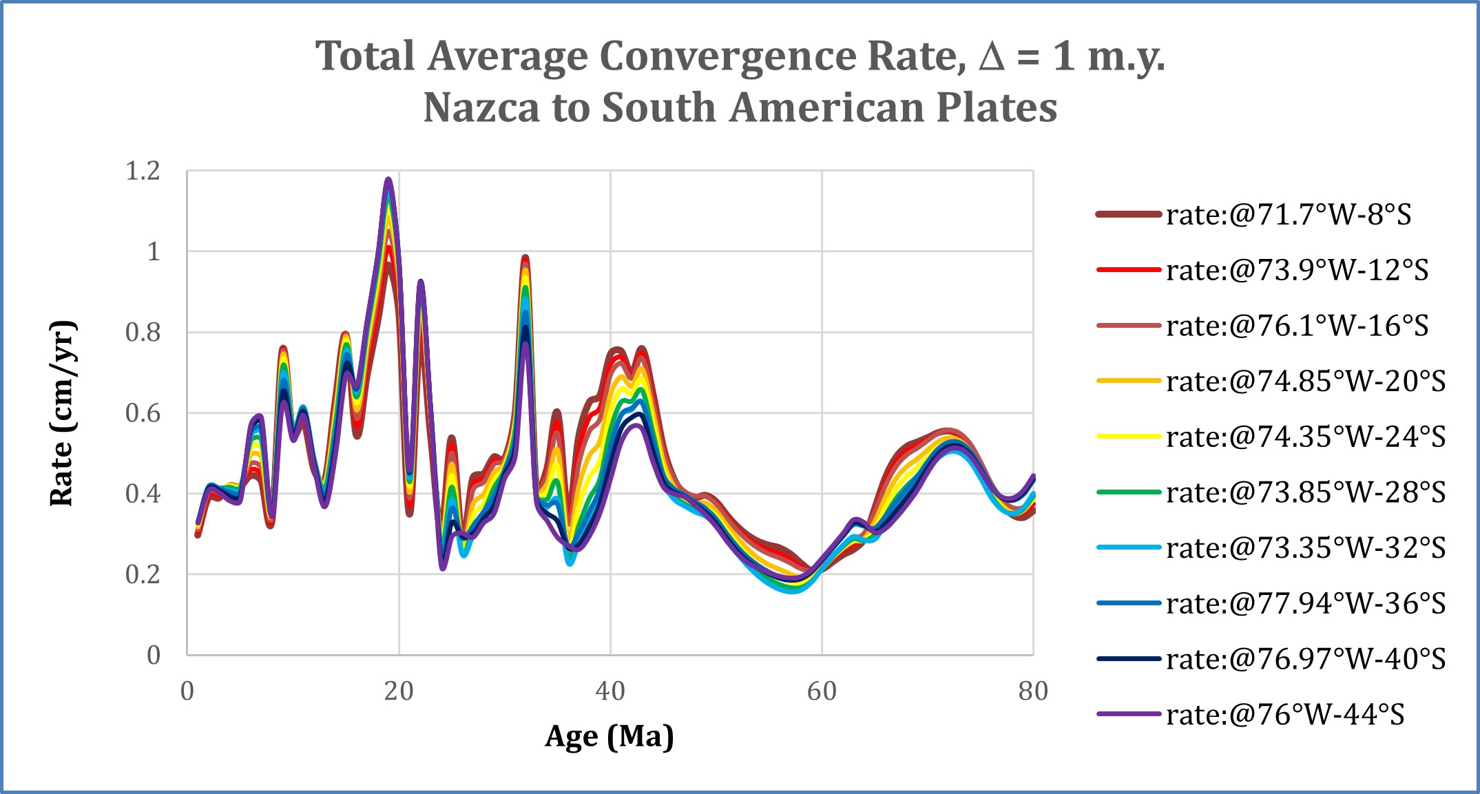 Global reconstructions of the motion of the subducting Nazca/Farallon plate (the Farallon plate fragmented into the Nazca and Cocos plates at ~23 Ma) relative to the upper, South American, plate follow the circuit Nazca/Farallon-Pacific-West Antarctic-East Antarctic-African-South American (plate-pair sources are indicated in the Table A1 in the Appendix, with parameter values in Supplementary Table 1), interpolated at 1 Myr increments from 0 to 80 Ma, using cubic-splined pseudovectors (converted from the original spherical coordinates) with magnitude equal to the total rotation rate (Pilger, 2003). The plate parameters are calibrated to the recent timescale of Ogg (2020), which is tied to the astronomically tuned timescale of Gradstein et al. (2020). Rotations are composed using quaternions transformed from the pseudovectors (Pilger, 2003), with further composition of the total reconstruction quaternions to rotate the (unit vector) points; the latter reconstructed vectors are inverted to spherical coordinates for display in Google Earth. Table 1 provides the calculated Nazca/Farallon-South America reconstruction parameters at 5 Myr increments (more detailed parameters at 1 Myr increments are provided in the Supplementary Data along with the source plate-pair reconstructions). Uncertainties are not provided because they cannot be legitimately calculated via interpolation (the rationale is provided in the Supplementary Data; see also discussion in Pilger, 2007). Instantaneous rotation rates are calculated at the same 1 Myr increments using the derivatives of the spline parameters (using the modified Smith, 1985, equation by Pilger, 2003) at several locations along the oceanic trench.