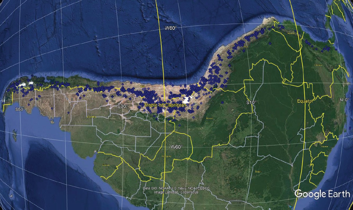 FIG. 13. Full loci of isotopic dates from eastern Brazil and Paraguay (blue squares) backtracked with respect to the Tristan hotspot reference frame using (spline interpolated) parameters of Müller et al. (1993) for 0-130 Ma and Maher et al. (2015) for 130-150 Ma. Also shown are Jurassic and Cretaceous dates (red diamonds) in Colombia, Peru, Bolivia, Argentina, and Chile. (Note how many back-tracked loci come close to the data points in the Andes.) Data points and loci provided in Supplementary File.