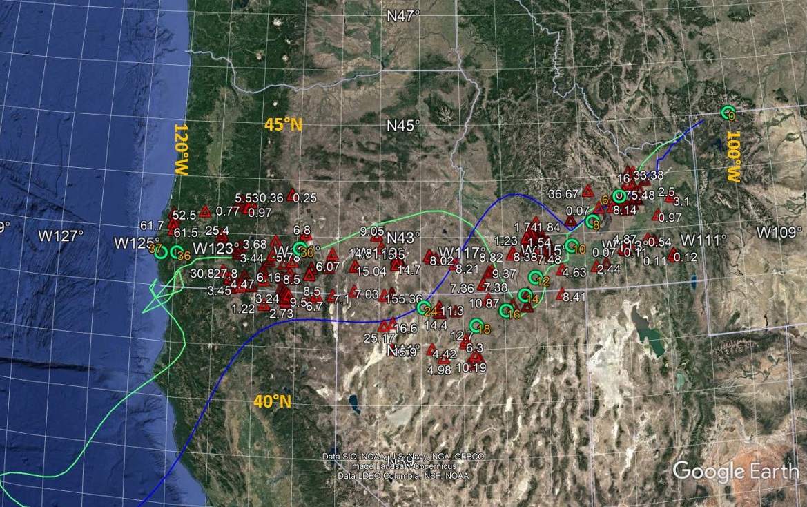 In addition to strengthening the proposal that hotspot traces may contribute to low-angle subduction, this study also provides support for an expanded distinct Pacific hotspot reference frame. This domain extends from Hawaii in the northwest to Juan Fernández in the southeast and includes Louisville to the southwest and the Gulf of Alaska and Yellowstone to the northeast. Figure 11 illustrates the reconstructed Yellowstone trace beneath the northwestern United States, including the Basin and Range Province (after McQuarrie and Wernicke, 2005), in the Hawaiian reference frame (using the composite model), and a reconstructed trace relative to the M93 Atlantic-Indian Ocean frame model. Isotopic dates along the reconstructed trace in figure 11 correspond relatively well with the trace in the Hawaiian frame (volcanism began after the arrival of the trace for a given longitude). The Hawaiian and Tristan (Atlantic-Indian Oceans) frames appear to deviate from one another (e.g., Duncan, 1981; Norton, 1995; Raymond et al., 2000). The moving-hotspot reference frames (e.g., O’Neill et al., 2005; Doubrovine et al., 2012) are rooted in a mantle convection model based on seismic tomography, with velocity converted to density, and radial, but not spherical, viscosity variations. The hotspots deviation from the convection model is then globally averaged over the last 80 Myr with dates from four traces to produce final models. Gaastra et al. (2022) showed that two of the traces, the Hawaiian-Emperor and Louisville, from the Pacific plate, do not require significant motion between their source hotspots over the same period based on more recent dating, modeling incorporating data from other Pacific plate traces, and treating the hotspot locations as variables. Similarly, the two hotspot traces from the Atlantic and Indian oceans are consistent with a separate reference frame as Müller et al. (1993) defined (modifying Duncan, 1981; see also Maher et al., 2015). Perhaps, instead of globally moving hotspots (such as in the Atlantic-Indian frame), there are the two geographically restricted reference frames: Hawaiian (beneath the plates of the Pacific Ocean and western North America) and Tristan (beneath the Indian and the South and central North Atlantic oceans and bordering continents), with perhaps a third, Iceland, which includes most of Eurasia (Pilger, 2003).