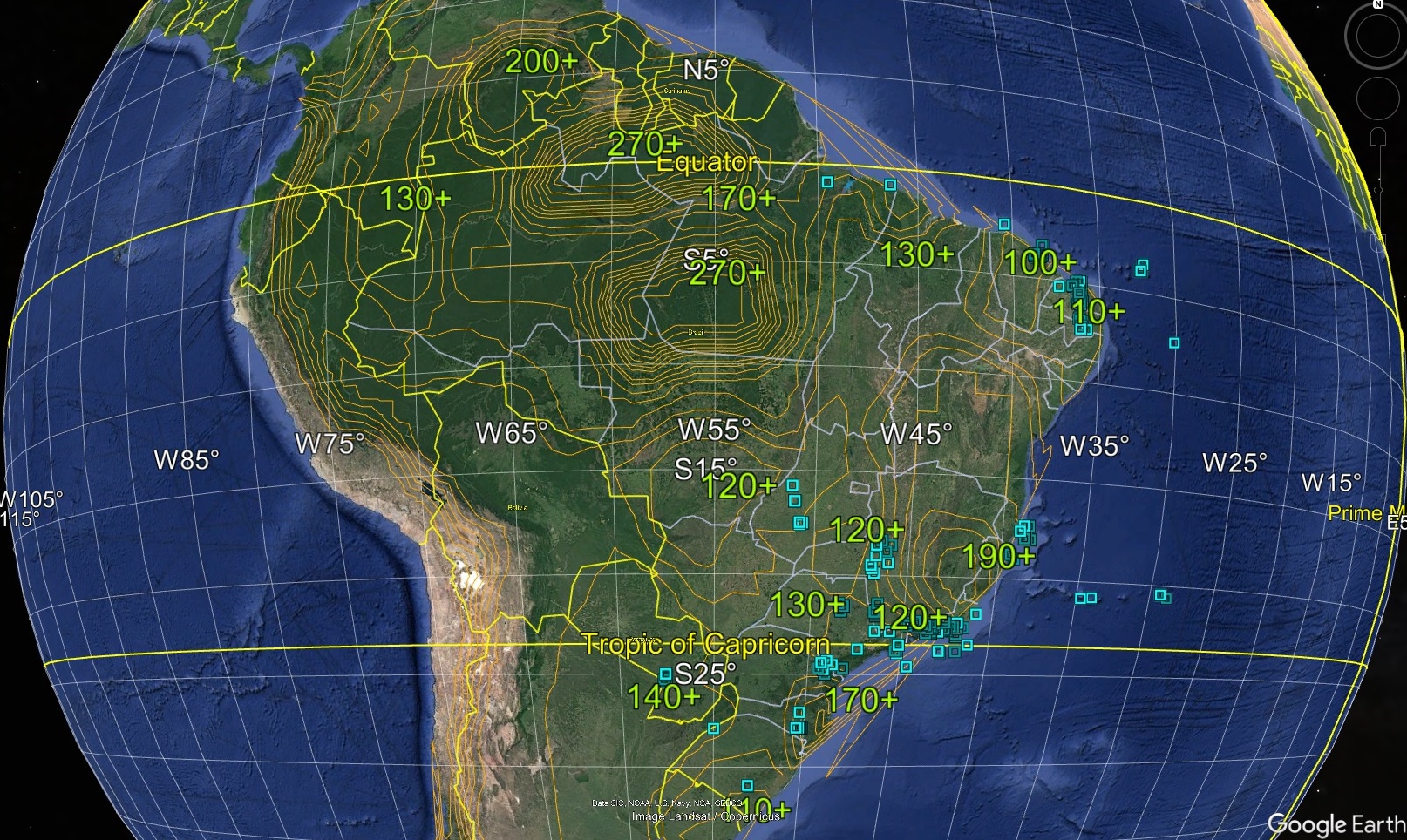 Figure 8 illustrates instantaneous Nazca to South American convergence rates and directions calculated at 1 Myr increments at locations along the Andean trench, via spline interpolation of rotation pseudovectors. The angles are measured clockwise from the trench. Resolution of source data is denser over the past 25 Myr, because of the greater resolution of source plate pairs in the South Atlantic, Southwest Indian, and Southwest Pacific oceans.