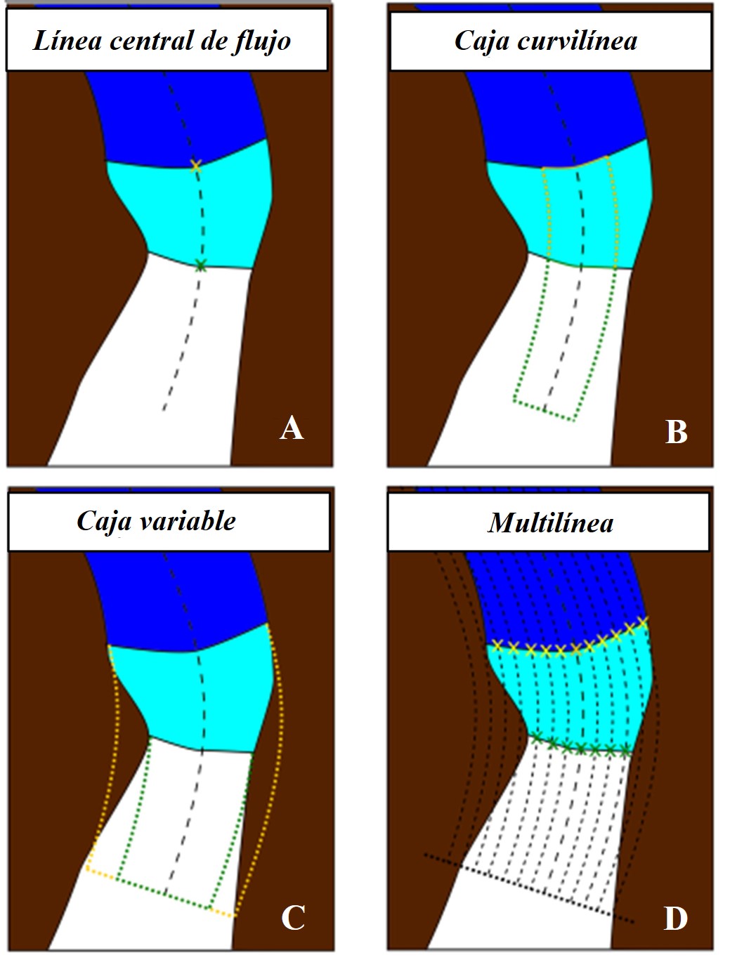 El método de caja curvilínea utiliza una caja de ancho fijo, generada a partir de la línea de flujo central para calcular la variación de la posición media del frente (Fig. 2B) y tiene la ventaja de que permite capturar la sinuosidad a lo ancho del frente. Cada caja curvilínea se generó con una función buffer al vector de línea central de flujo. Para evaluar la sensibilidad del método ante variaciones del ancho de caja, se efectuaron pruebas con 6 cajas curvilíneas de diferentes amplitudes (200, 400, 600, 800, 1.000 y 1.200 m de ancho). La posición relativa del frente se obtiene al simplificar la caja como un rectángulo, donde la medida de uno de los lados (longitud) representa la posición media del frente. De esta manera, se calculó la posición del frente utilizando la ecuación 3.