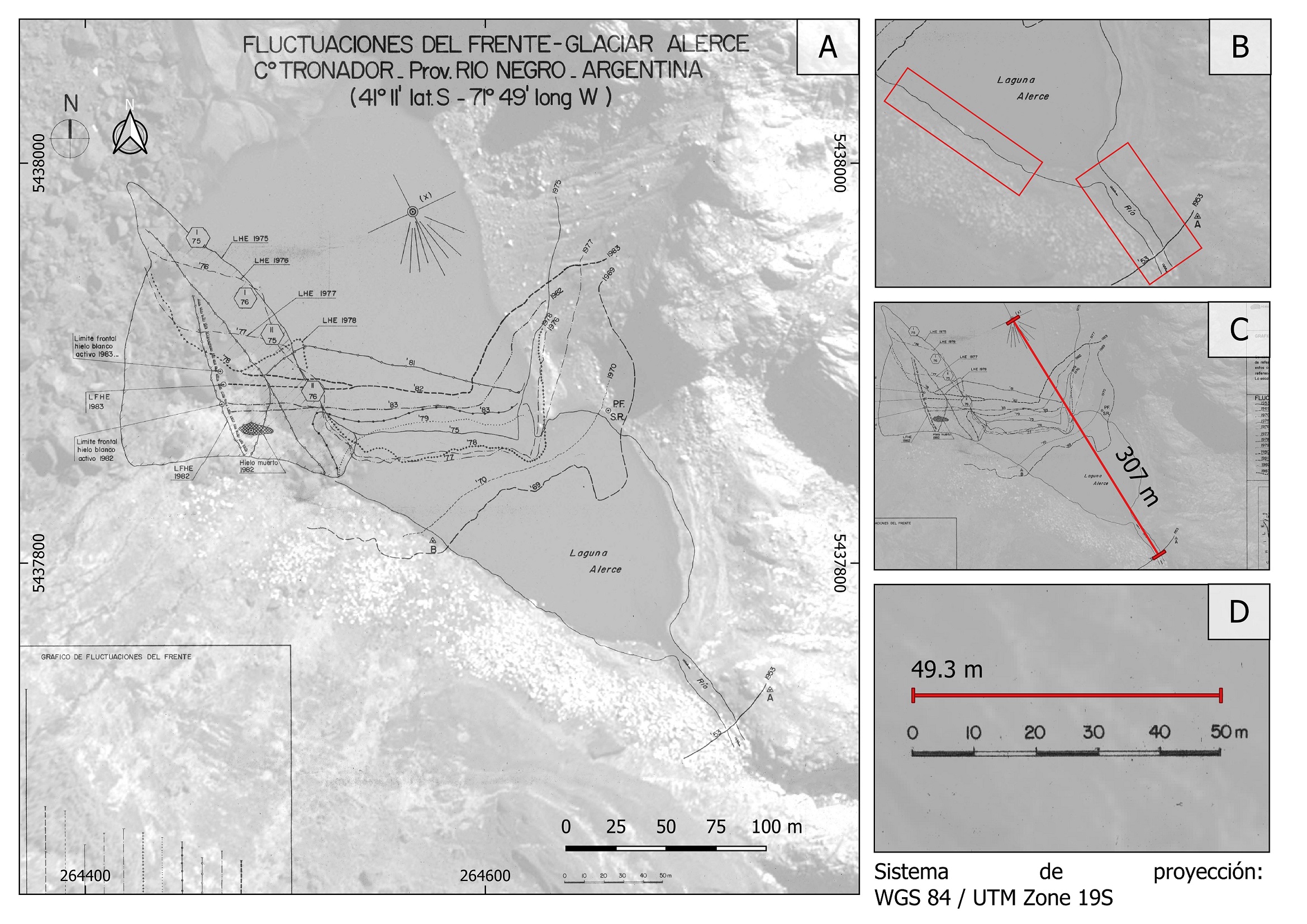 Se georreferenció el mapa de las fluctuaciones del frente (Fig. 3A) con un RMS de 21 m. A pesar de la limitada cantidad de puntos de control (n=20), se obtuvo un buen ajuste entre los bordes del lago y los ríos mapeados (Fig. 3B). Según la información disponible en el mapa, la posición del frente para el año 1953 se encontraba a una distancia de ~305 m respecto al punto de referencia, mientras que la medida en el mapa digitalizado fue de 307 m (Fig. 3C). Por último, la diferencia entre las longitudes de la escala gráfica del mapa y la escala del mapa georreferenciado fue de 0,7 m (Fig. 3D).