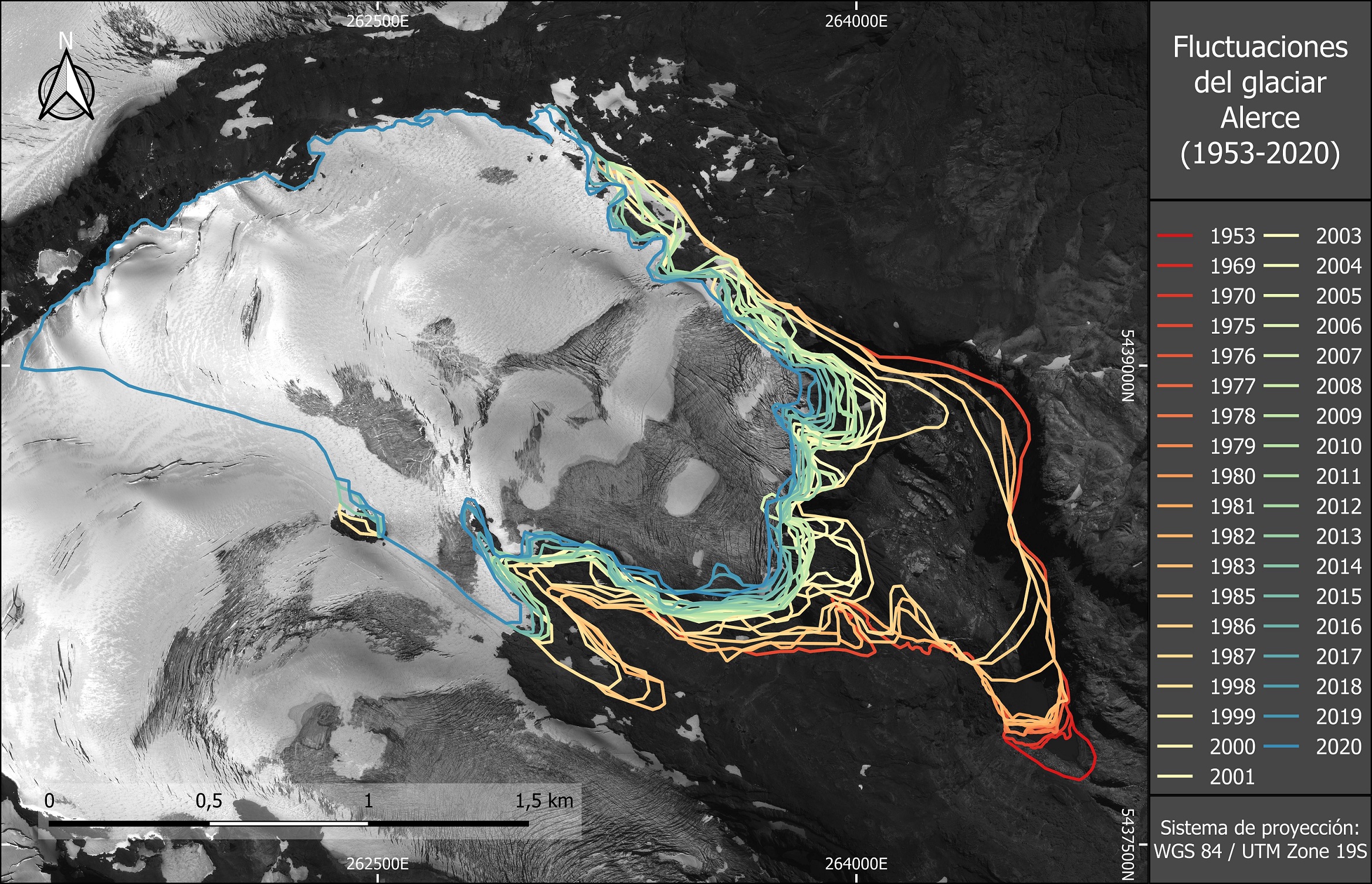 FIG. 6. Extensión del glaciar Alerce para el período 1953-2020. La imagen de fondo corresponde a una escena Pléiades del año 2019.