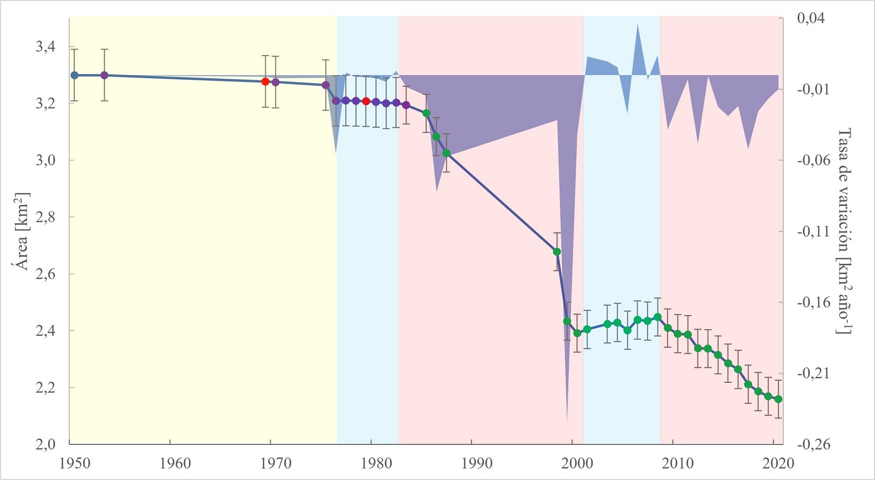 Los cambios en el área y la posición del frente evidencian un marcado retroceso entre 1953 y 2020. El glaciar perdió un 1,1±0,1 km2 de su superficie (35%) y alcanzó un retroceso acumulado de 1.492±40 m (67%). A su vez, fue posible distinguir diferentes patrones de cambio a lo largo del tiempo. En primera instancia se observa una etapa de retroceso (1953-1976), seguida de un período de estabilidad (1977-1983), luego un retroceso mayor (1984-1999), otro período estable (2000-2009), y finalmente un nuevo período de retroceso hasta el año 2020. Sus tasas de retroceso coinciden con las observadas en otros glaciares de la región, lo cual puede representar una señal climática regional.