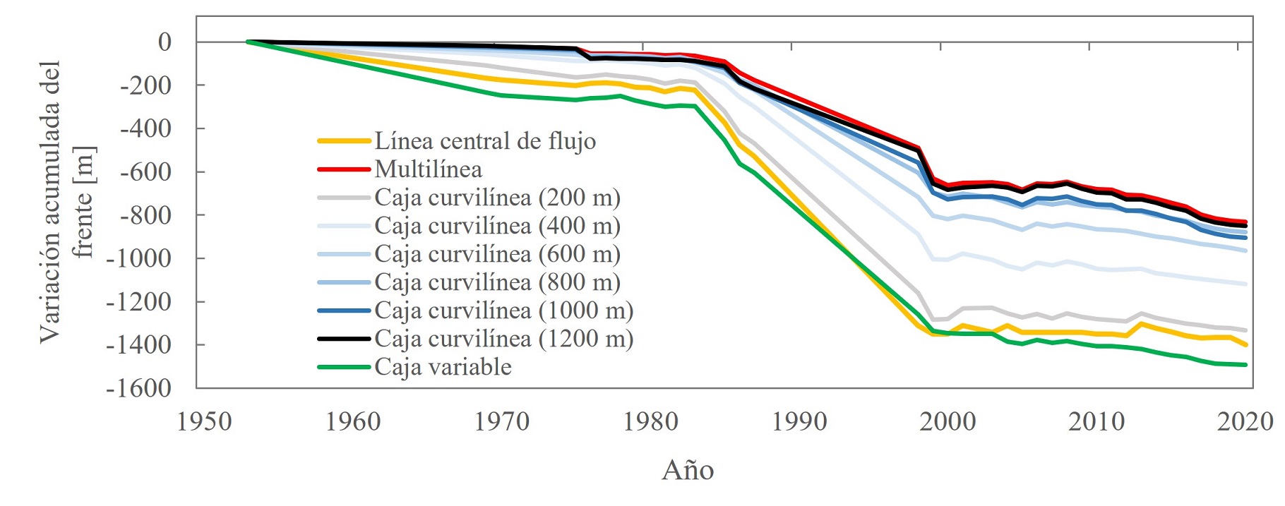 Analizando los cambios de longitud según diversas metodologías (ver sección 3.4) se encuentran diferencias significativas (Figs. 9 y 10). La mayor de ellas está entre los métodos de caja variable y de multilínea (variación acumulada >640 m), donde para el primer método se obtiene una tasa media de retroceso ~2 veces mayor comparada con el segundo.