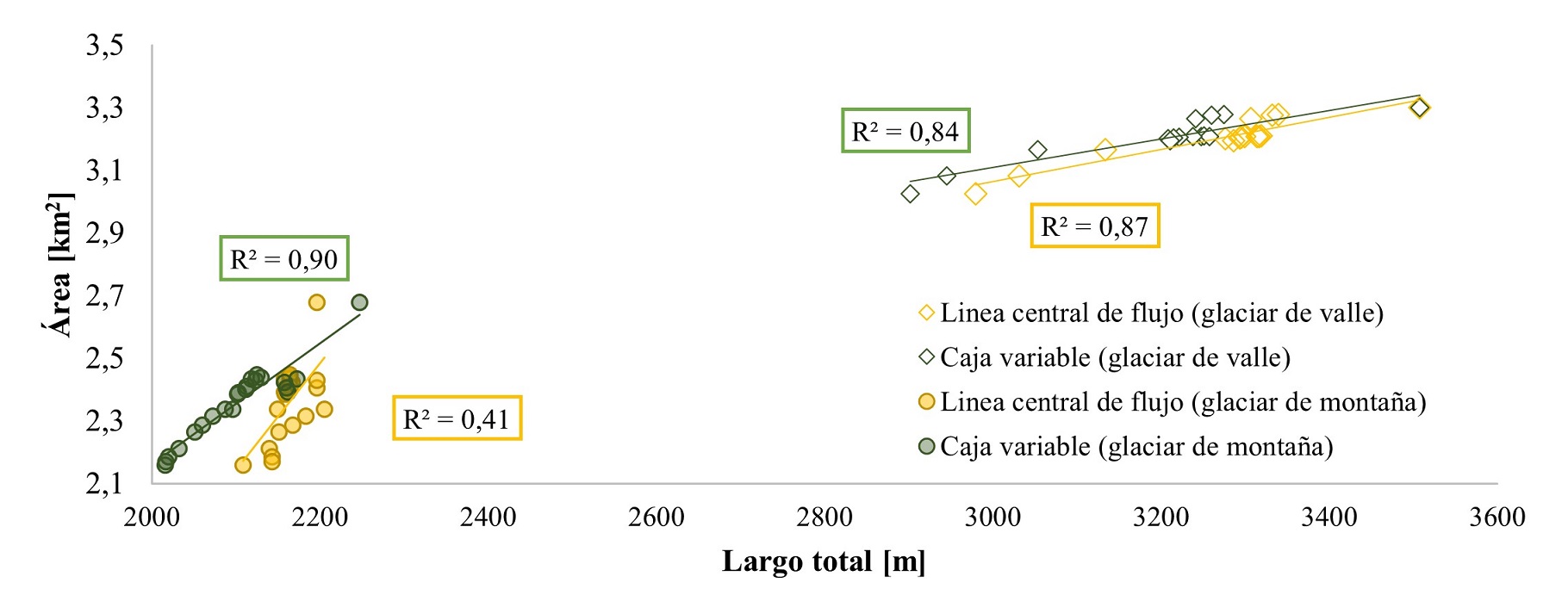Debido a las variaciones morfológicas del glaciar, la relación entre la longitud y el área también cambia a lo largo del tiempo (Fig. 12). Mientras el glaciar Alerce fue un glaciar de valle (entre los años 1953 y ~1980), la relación entre el cambio de área y el de longitud fue entre 3 y 6 veces menor que cuando se transforma a un glaciar de montaña (desde el año ~1980 en adelante), según los métodos de caja variable y de línea central de flujo, respectivamente. El primero tiene la mejor correlación entre cambios de área y longitud, tanto cuando el glaciar Alerce fue un glaciar de valle (R2=0,84) como cuando se convierte en un glaciar de montaña (R2=0,90). Sin embargo, no sucede lo mismo con el segundo método. Cuando el glaciar tiene una morfología de valle, la correlación entre los cambios de área y longitud es buena (R2=0,87), mientras que cuando tiene una morfología de montaña, la correlación ya no lo es (R2=0,41).