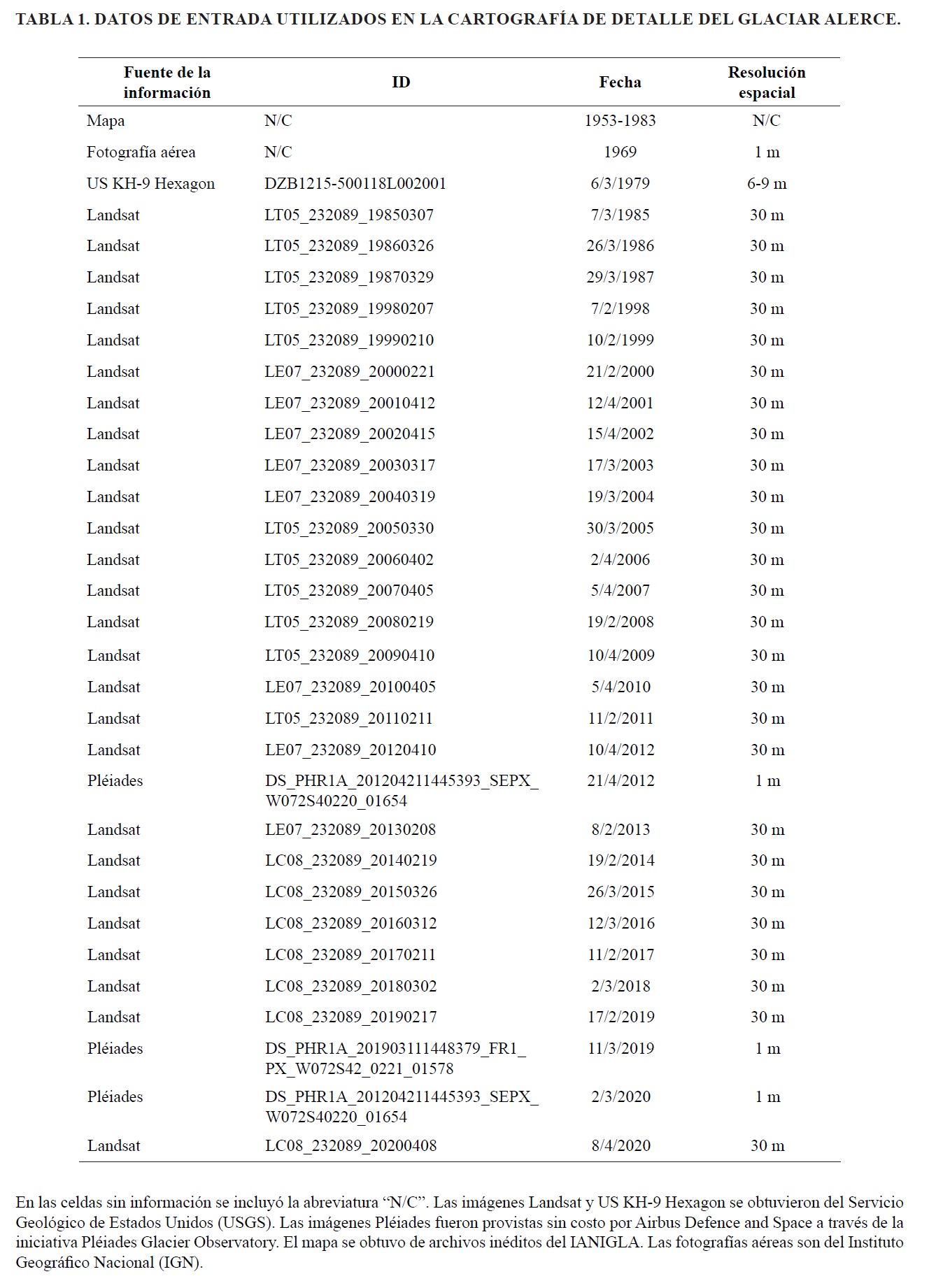 Para reconstruir la morfología del glaciar previa a la década de 1980, se emplearon fotografías aéreas, imágenes del satélite US KH-9 Hexagon (Masiokas et al., 2015) y el mapa digitalizado. Para los años posteriores se utilizaron imágenes satelitales Landsat y Pléiades (Tabla 1), priorizando imágenes tomadas hacia fines de verano (febrero-abril). En función de la disponibilidad de imágenes, se seleccionaron aquellas con menor cobertura de nubes y ausencia de errores de procesamiento (Wulder et al., 2008).
