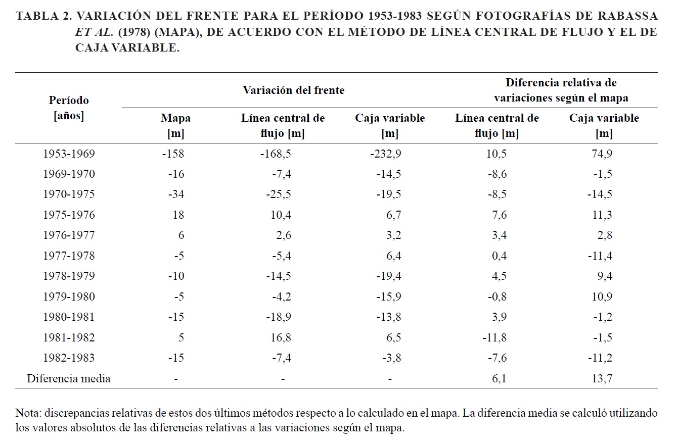 Las fluctuaciones del frente registradas en el mapa (Figs. 3A y 6) coinciden mejor con los resultados obtenidos a través del método de línea central de flujo (Tabla 2), lo cual es esperable, dado que las metodologías para determinar la posición del frente son similares para ambas técnicas (ver Materiales y métodos). Las diferencias observadas están dentro del error del método. En el caso del mapa, la posición del frente está dada por la distancia en línea recta que existe entre el límite del frente y un punto de referencia arbitrario. Por lo tanto, las diferencias están asociadas al punto donde interseca cada línea con el frente, o bien, por una desigualdad entre la longitud de una línea curva (línea central de flujo) respecto a una línea recta (mapa). A su vez, el hecho de que las variaciones del frente entre ambas metodologías sean similares puede entenderse como resultado de una buena georreferenciación del mapa. Las diferencias en la variación del frente del método de caja variable respecto a los datos del mapa también están dentro del error del método.