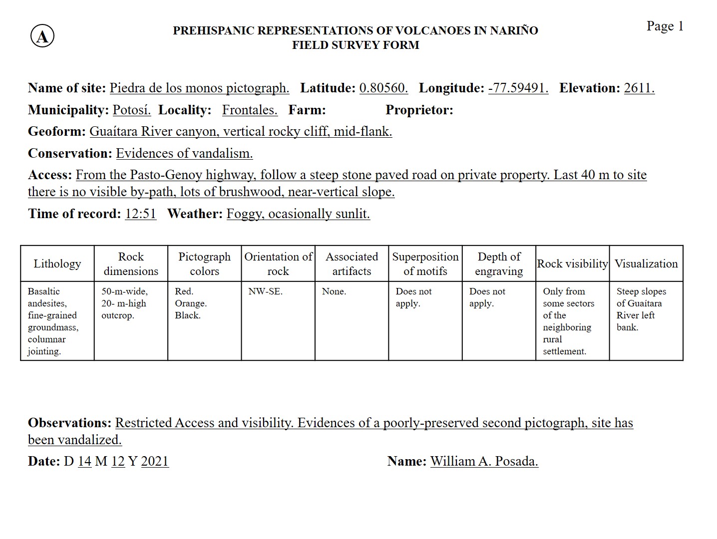 Digitized versions of the field survey forms of eight rock art sites in the State of Nariño (Colombia). For each form we have included an additional page showing photographic evidence and details of the rock art that was observed in the field. The sites are organized according to the Supplementary material 2 of the paper. Photo credits: In El Higuerón pictograph site field survey form; photos A, B, and D, are by Christian E. Chicaiza. All other photos are by John J. Sánchez. See table at the end for an explanation of each attribute.