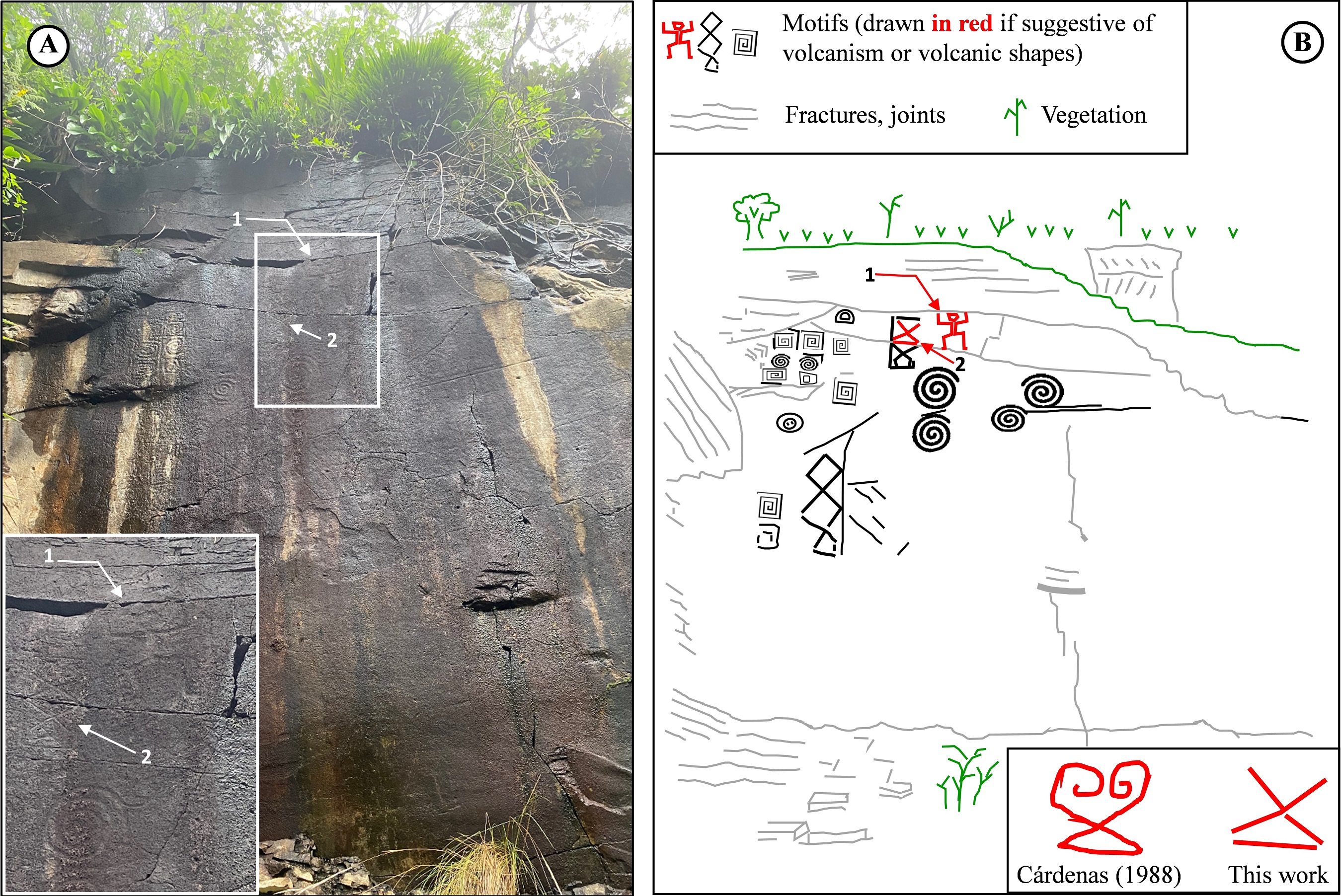 The sketches drawn from the pictographs and petroglyphs vary among authors, but very often it is possible to identify motifs that convey the idea of volcanism, even when the figures differ. For example, in the case of the Piedra de Guagua Rayo petroglyph (Genoy locality, Pasto) (Supplementary materials 2 and 4), we identified just to the left of the anthropomorphic figure a triangle with two of its sides projected upwards (Fig. 5). Cárdenas (1988) drew, for the same area, a mixed motif that looks very volcanic: a triangle with two sides that are projected upwards to form a complex figure. This overall consistency with our independent observations supports the suggestion of volcanic depictions being present in the rock art of Nariño.