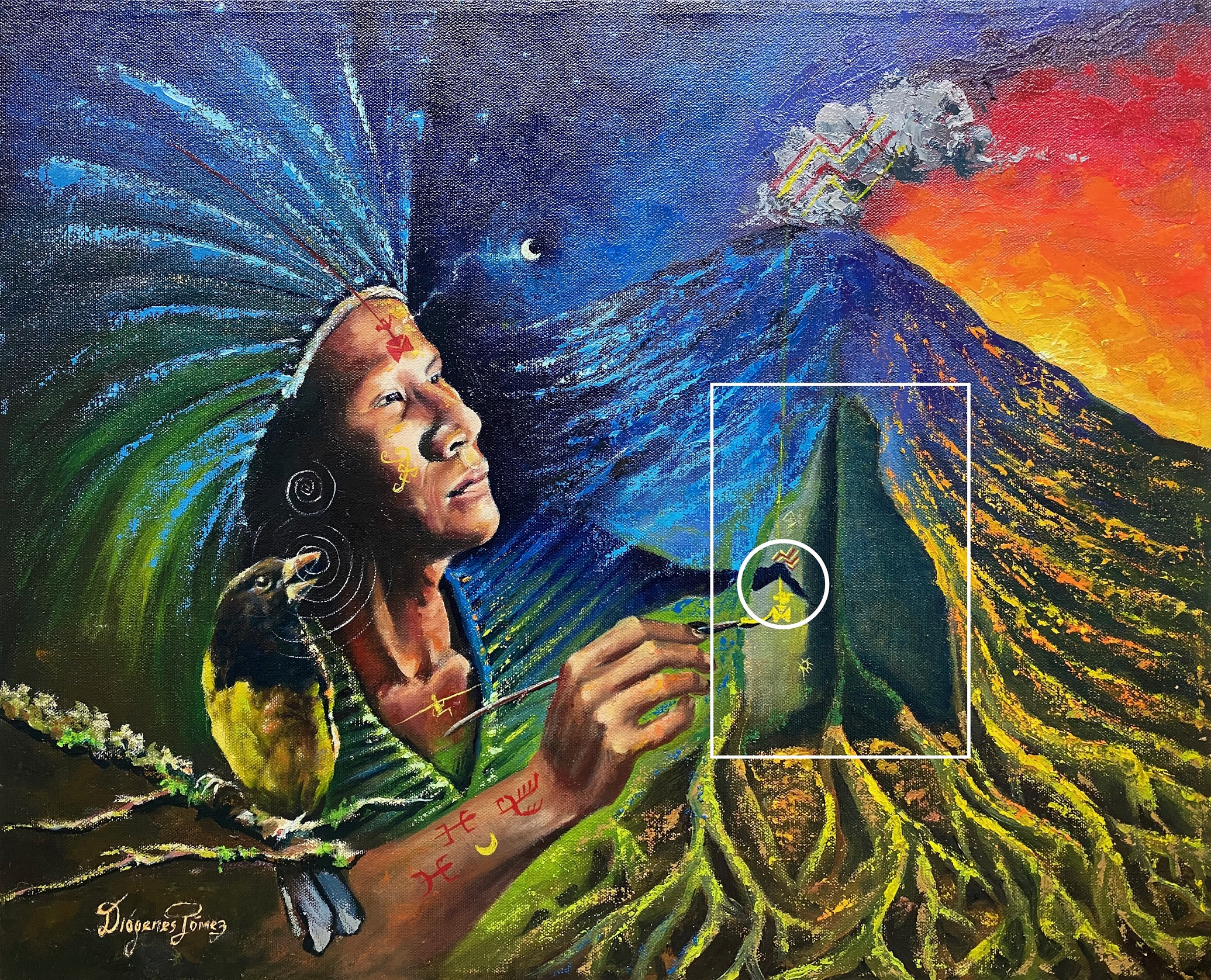 Fortunately, our guide and hostess in the Mapachico locality (Indigenous Governor Sonia Gómez) was the sister of Diógenes A. Gómez. Mr. Gómez is a local artist who knew the site where the El Higuerón pictograph was, dedicating part his Master´s thesis to the analysis of it (Gómez, 2017). He agreed to meet with us, and through his direct impressions on this pictograph we could independently confirm that there was a motif suggestive of Galeras volcano with wavy lines on its top. He also agreed to produce a canvas painting with his memories of the pictograph (Fig. 6).