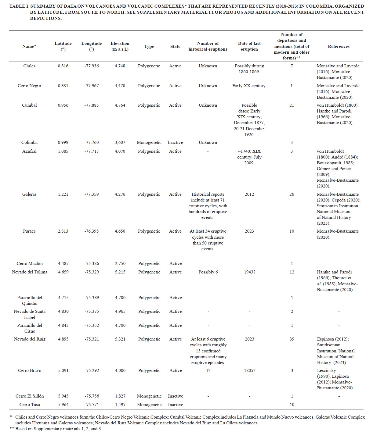 Modern graphic representations of volcanoes in Colombia vary in type, spatial character (local, regional), temporal nature (short-lived, long-lasting), amount of representations, and also in the way they are used (context, purpose). A recent survey by Sánchez and Calvache (2018) reported that 19 volcanoes (including both dormant and active centers) were depicted in 71 localities, mostly in neighboring zones. This survey has been updated and new data are shown in the present work (Fig. 1). More recently, Calvache and Sánchez (2022) focused on seven volcanoes in the State of Nariño (southwestern Colombia) and found that more than half of the depictions related to art, culture, and music themes. For the span of time that these recent datasets cover (~1,558-2020 CE), and considering that just the two aforementioned studies together reported on nearly 500 observations, modern depictions of volcanoes in Colombia abound.