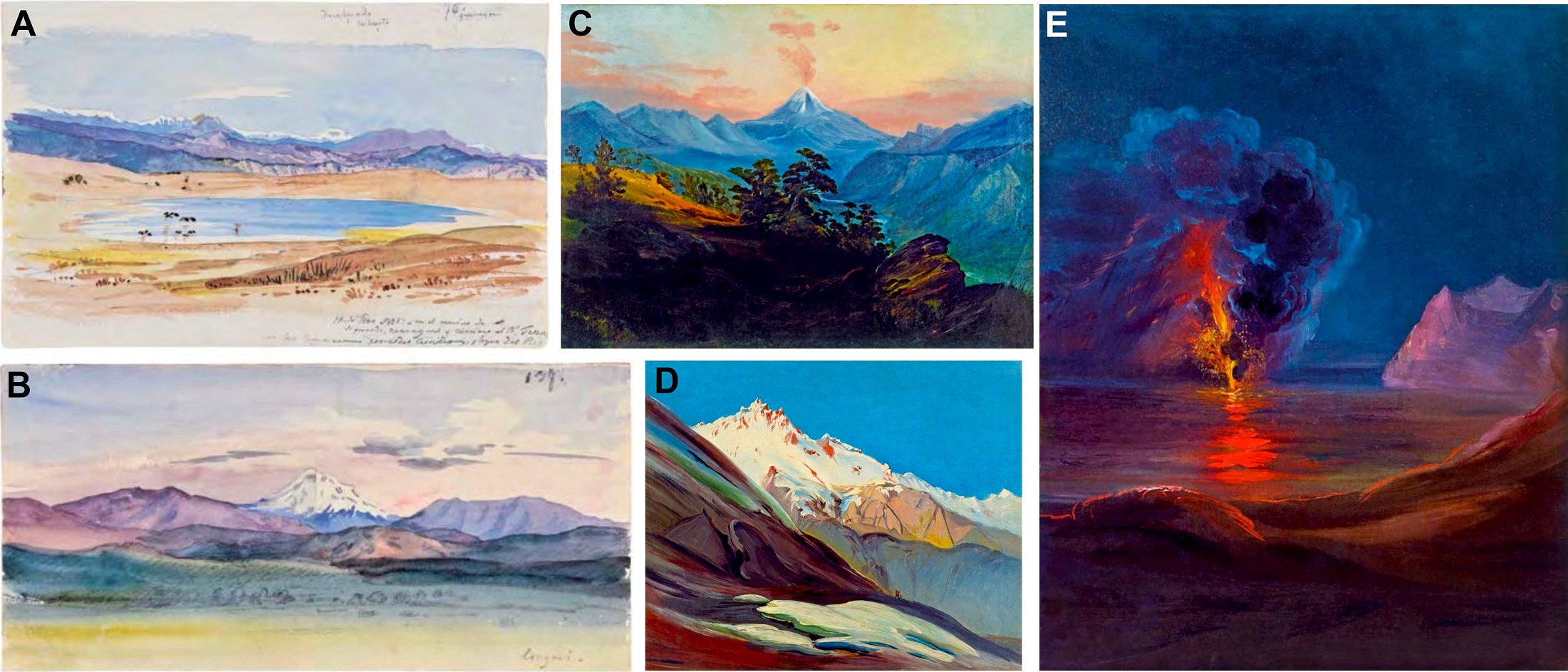 Several Chilean and international artists have explored and reflected on the presence of volcanoes in Chile through the creation and dissemination of artistic images. This exploration has taken place in drawing, graphics, and painting. Among the earliest painters to depict Chilean volcanoes as central figures is the German artist Johann Moritz Rugendas (1802-1858) (Diener, 2012) (Fig. 2A-E). Between 1834 and 1842, Rugendas embarked on various expeditions throughout Chile to capture its diverse natural and cultural scenery. His artistic corpus was extensive, comprising over a thousand drawings, watercolors, and around 150 oil paintings, with the Andes mountain range serving as a profound source of inspiration (Diener, 2012).