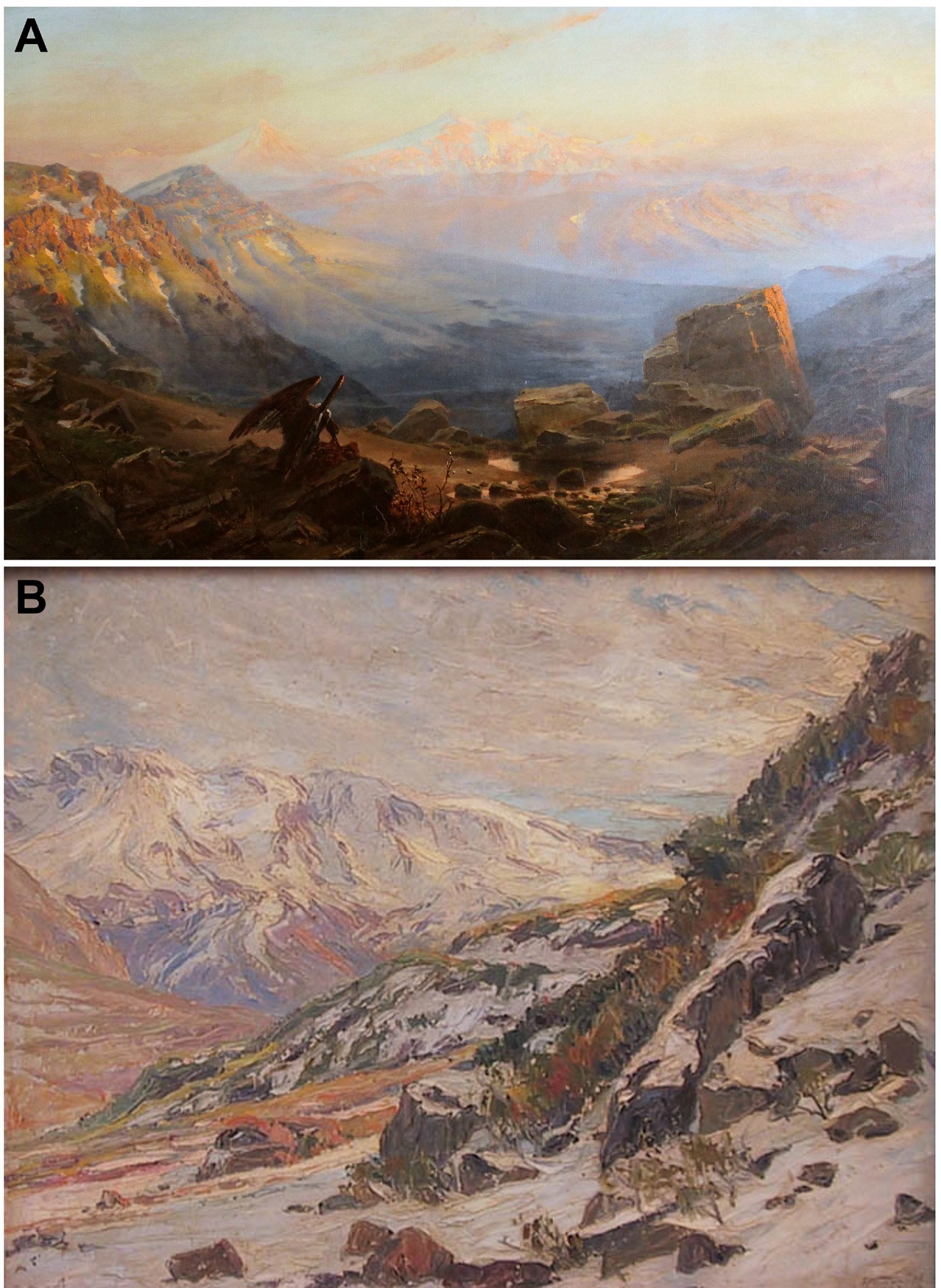Thomas Somerscales (1842-1927) was an English artist who was one of the most representative in the field of landscape, sea, and naval glory painting in the 19th century in Chile. His realistic representations of rivers, lakes, and especially the Pacific Ocean are a proof of the productive phase that 19th century painting had in Chile (Cinelli, 2020). One of his paintings, Vista del Volcán Antuco (View of the Antuco volcano) (1881), introduces the observer to the landscape, including the fauna and the rocks around Antuco volcano (Fig. 4A).