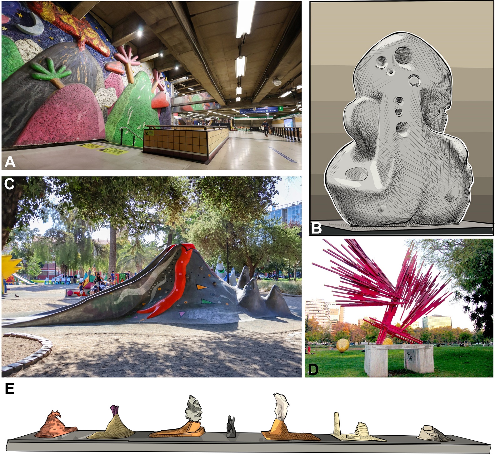 In the sculptural playground of Brazil square (Plaza Brasil), in the center of Santiago, there is a concrete volcano-shaped slide. This work was created in 1993 by French-Chilean artist Federica Matta (1955-) and contains representations of a series of lava flows erupting from the central vent of a conical volcanic edifice (Fig. 8C). This work also contains a gray stripe with sinuous edges that can be interpreted as a representation of eruption-related flows or deposits (e.g., lahars, pyroclastic density currents). The volcano slide is accompanied in the center of the square by several other sculptures of her own design, which serve as play elements for children and draw their inspiration from various themes related to national identity, such as the Andes mountains and the Santa Lucía hill. Through the play, the volcano was pointed out as a relevant political symbol, because it has the capacity “to connects us to the center of the Earth and the tectonic memory, where the effects of the trauma of the Pinochet dictatorship are transformed into energies that free us from pain and fear through the movement of magma and bodies; it is our life force” (de la Fuente et al., 2023, p. 34).