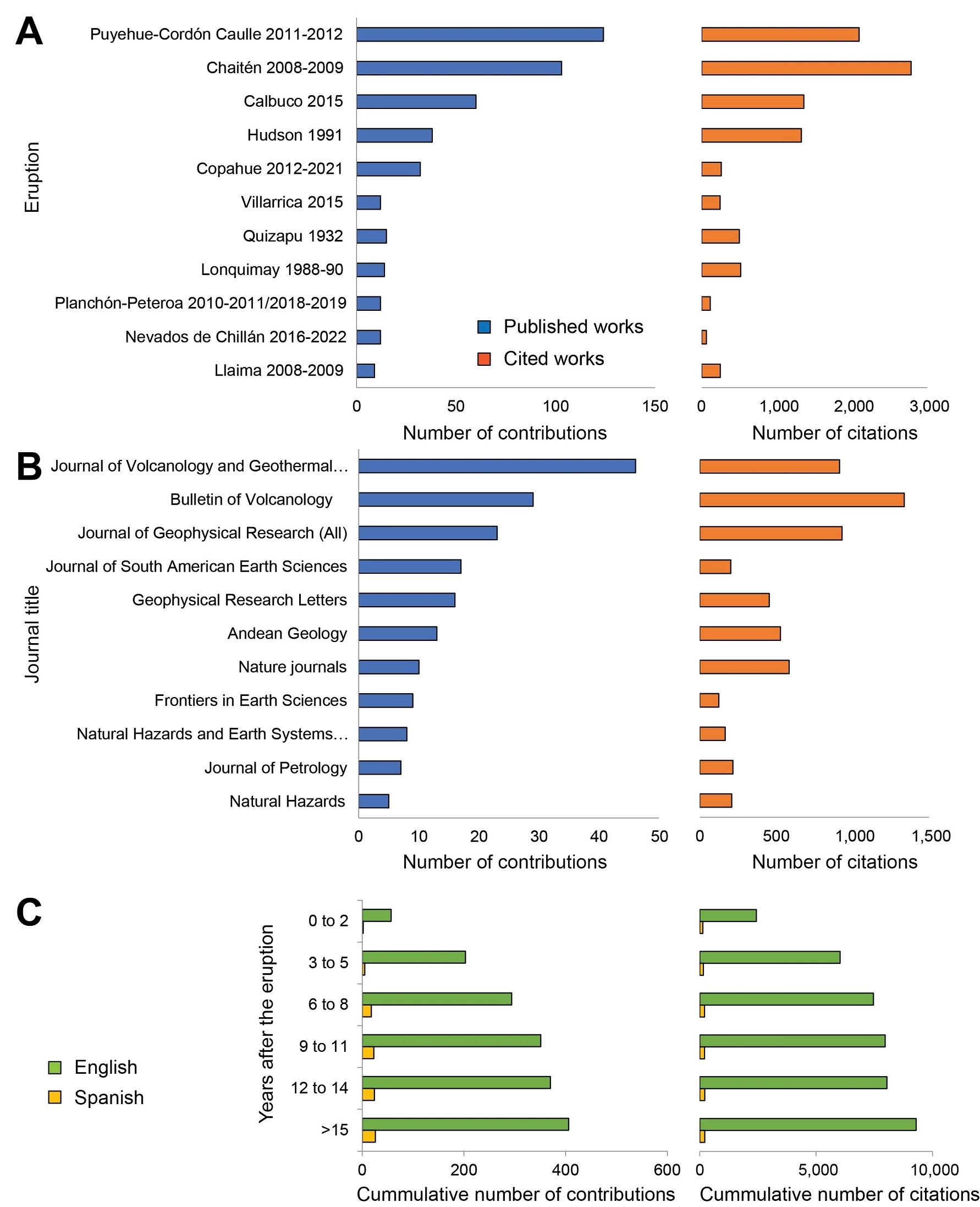 Nearly 430 peer-reviewed contributions have been published in scientific journals, accounting for >9,000 citations (see Supplementary Table 1 for a detailed description of each paper). These contributions show the widespread impact of SVZ eruptions in the scientific community. The most studied eruptions correspond, in decreasing order of publications, to the VEI 4-5 PCCVC (2011-2012), Chaitén (2008-2009), Calbuco (2015), and Hudson (1991) eruptions (Fig. 2A). Notably, scientific publications about Chaitén are the most cited (>2,700), followed by PCCVC (>2,000), and Hudson (>1,350). In comparison, the largest SVZ eruption of the 20th Century, the VEI >5 1932 Quizapu eruption, remains barely studied and poorly cited (Fig. 2A). On the other hand, modest (VEI ≤3) eruptions such as those at Lonquimay (1988-1990), Llaima (2008-2009), Planchón-Peteroa (2010-2011, 2018-2019), Villarrica (2015), and Nevados de Chillán (2016-2022) have been scarcely studied (<15 contributions each), despite their comparatively longer eruptive cycles. Of these, the only exception is the Copahue 2012-2021 eruptive cycle, with over 32 publications. All these VEI ≤3 eruption contributions show a similar number of citations (≤300). Paradoxically, while Villarrica ranks highest in the Chilean volcanic threat ranking (https://rnvv.sernageomin.cl/que-es-ranking-de-riesgo), scientific literature about its 2015 eruption remains limited and, in part, available as non-peer-reviewed contributions written in Spanish, which were not systematically considered in this article.