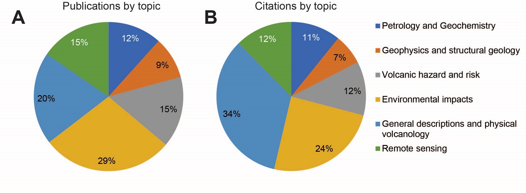 FIG. 3. Pie charts on the most published (A) and cited (B) topics for peer-reviewed articles on recent SVZ eruptions. Data acquired from Scopus on 13 March 2023.