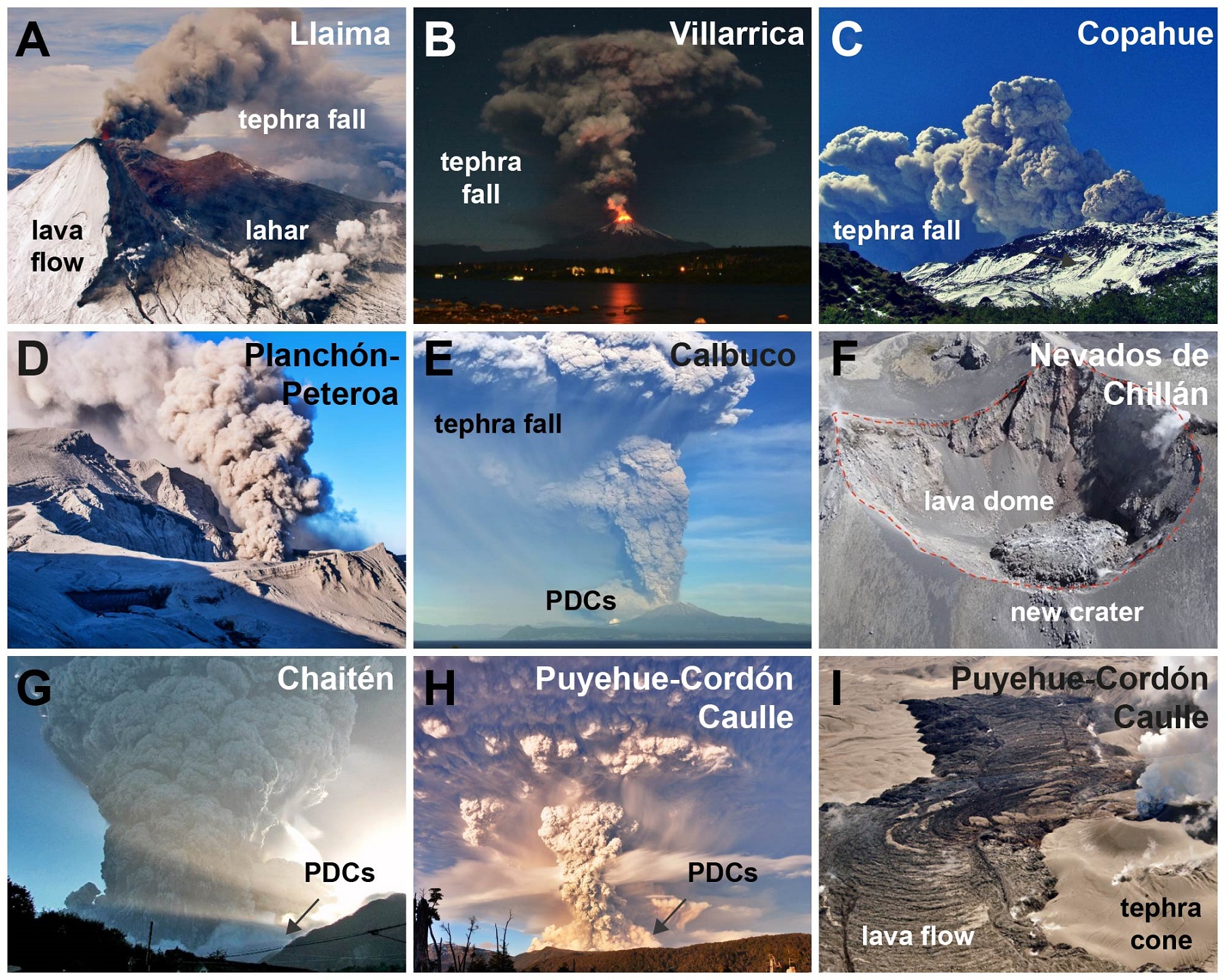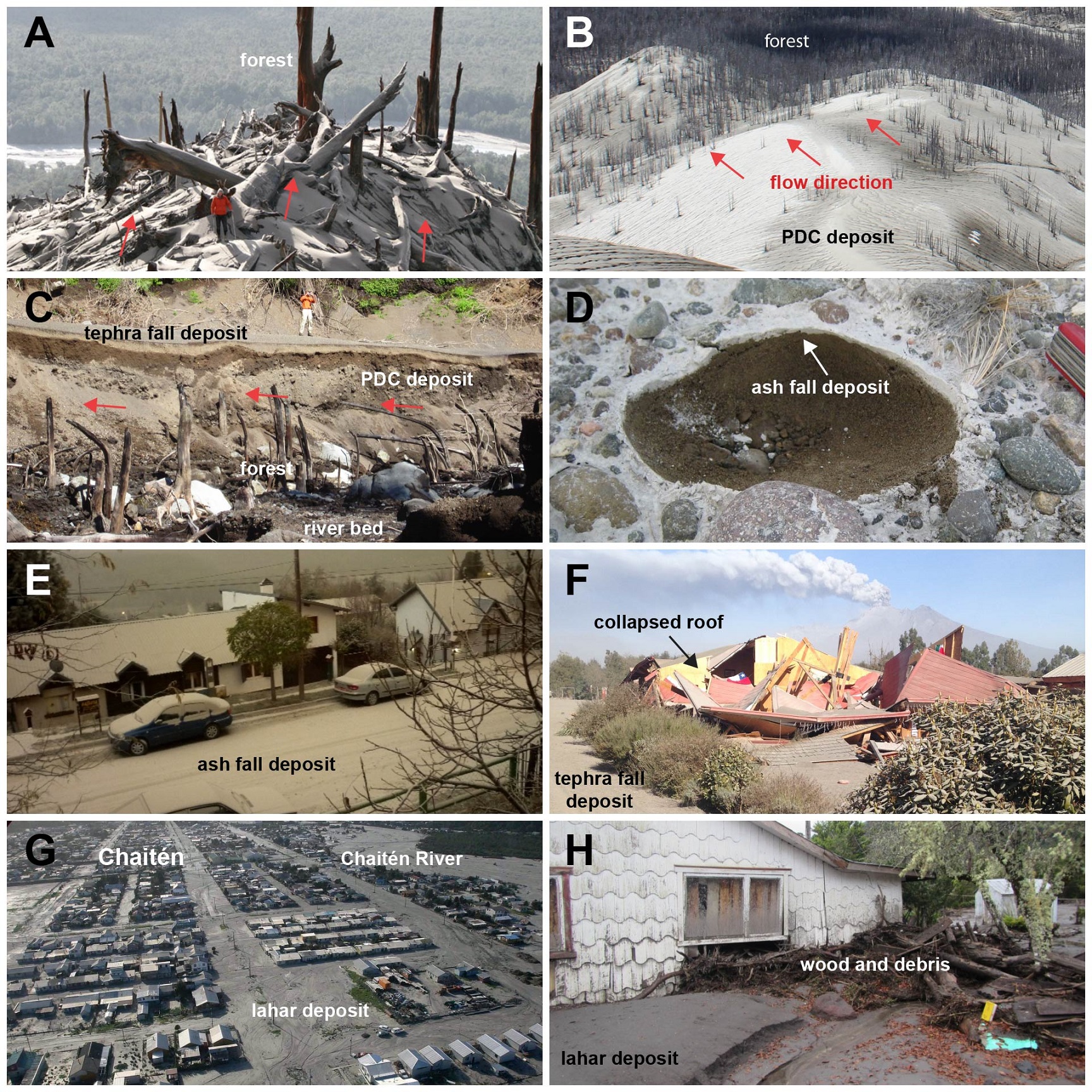 In terms of volcanic hazards, dilute PDCs (<200 °C) during the Chaitén eruption were both produced by eruptive column and lava dome collapse. and imprinted forest disturbance (Fig. 5A) with velocities up to 40 m/s (Major et al., 2013; Swanson et al., 2013). In contrast, little or no research has been carried out on the PDCs produced by the paroxysmal phase of the PCCVC eruption in 2011 (Fig. 5B). At Calbuco, PDCs occurred during the two eruptive pulses, reaching ~540-603 °C and velocities up to 36 m/s, which caused extensive damage to trees (Fig. 5C; Romero et al., 2023). Mixed avalanches formed by the interaction between PDCs, spatter agglutinates and ice were observed and described in the recent Llaima and Villarrica (Bertin et al., 2015b; Vera and Palma, 20172; Breard et al., 2020).