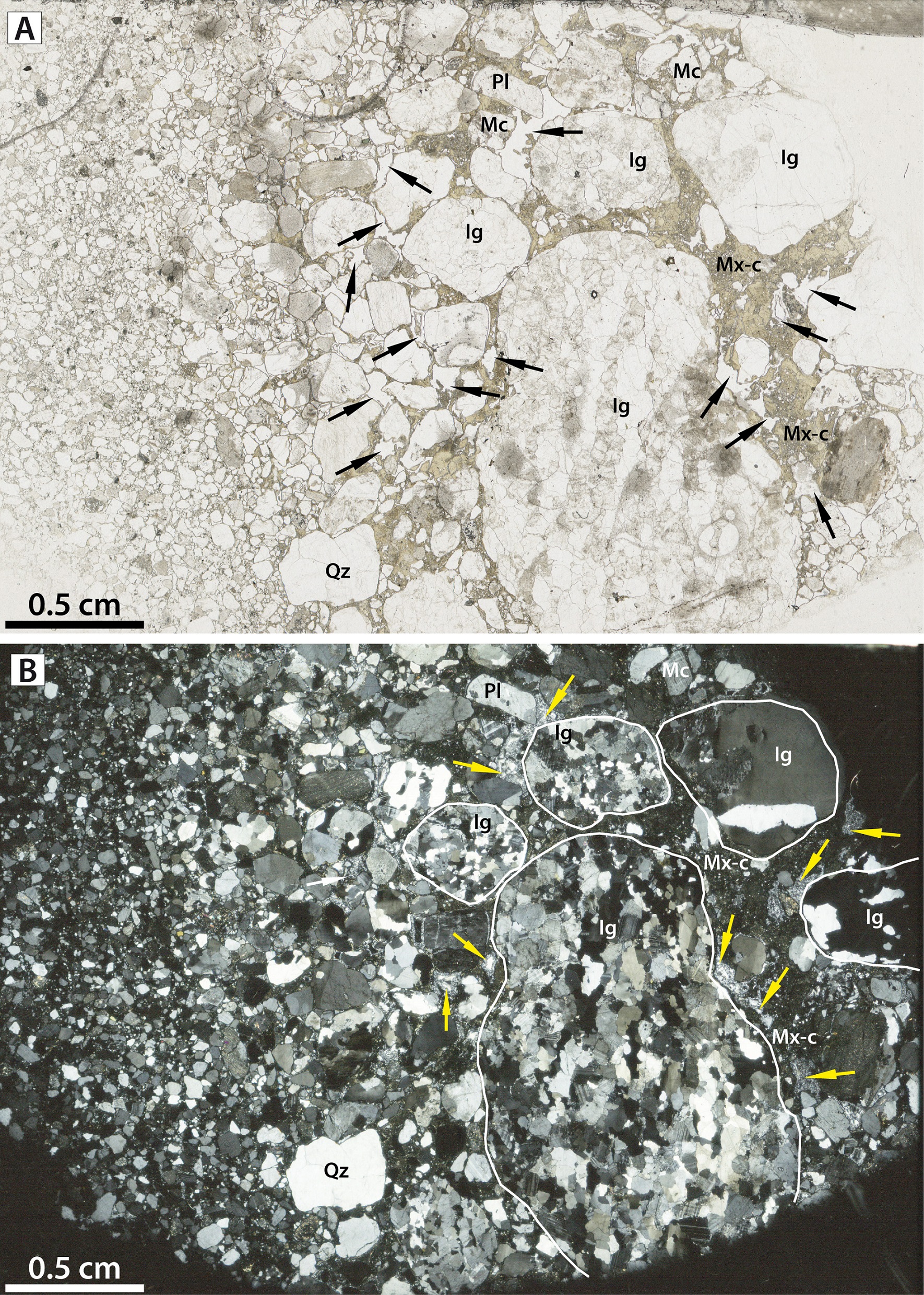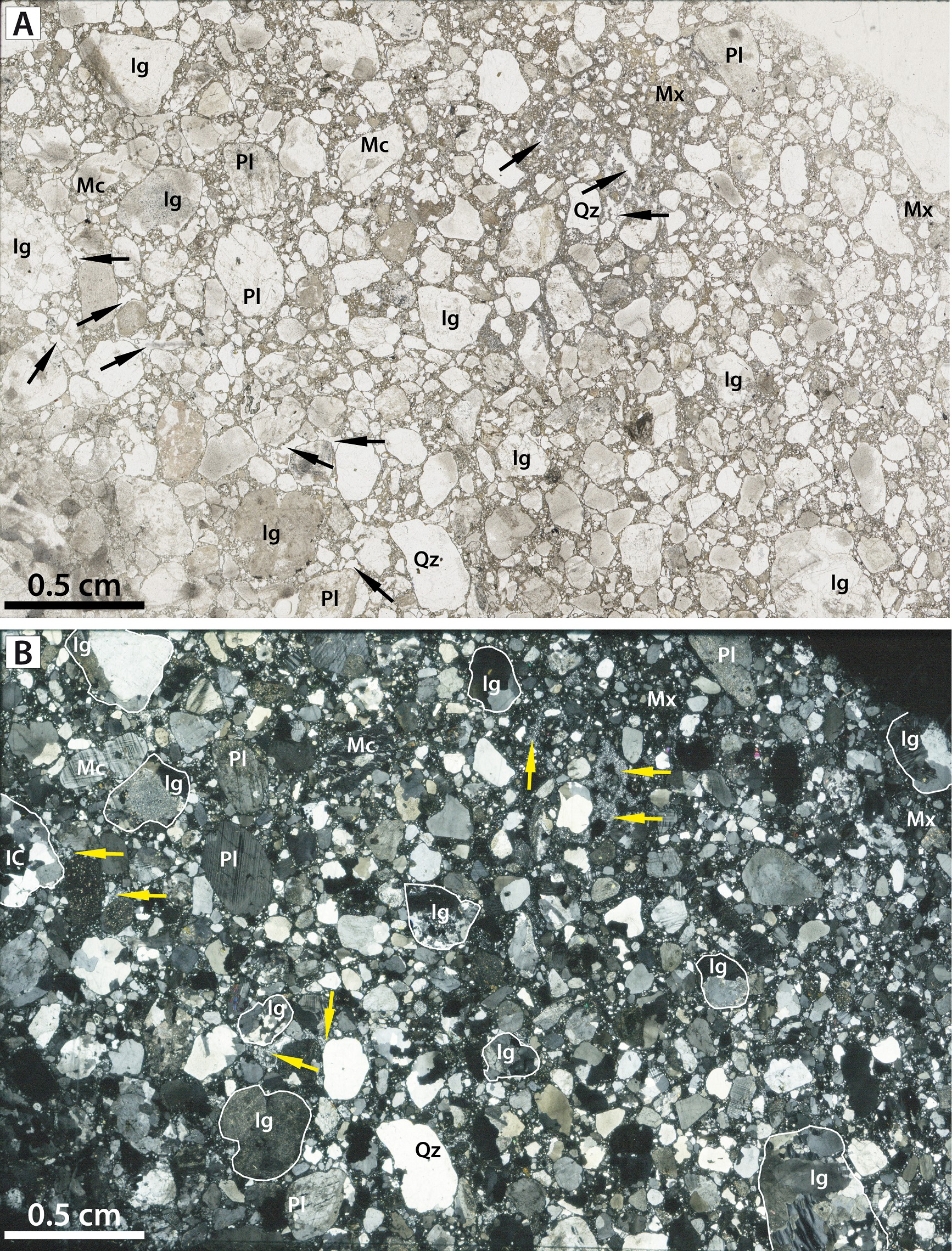 The sandstones are poorly sorted feldspathic lithic/arkosic arenites (Fig. 6A), with grains 0.8-1.8 mm in diameter (coarse to very coarse sand), and minor medium-fine silt and also some occasional granules. Gradual transitions from conglomerates to the feldspathic lithic/arkosic arenites can be observed at thin section scale (Fig. A3, Appendix A).
