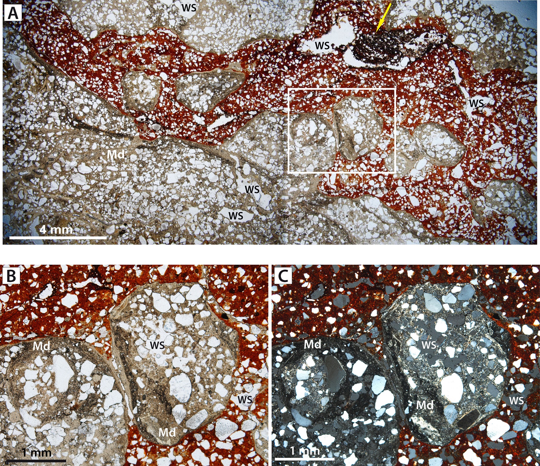Diffraction analyses conducted by Ford (1988c) and Ford and Gancio (1988) in iron-rich pisoliths in three sections of the Asencio Formation, revealed vertical changes in the kaolinite crystallinity (Kim et al., 2004; Fiore et al., 2011), suggesting that the mud-rich materials are made up of authigenic smectite. The ferruginized crust located on the top of the Asencio Formation can be attributed to an extreme drought event (Turner et al., 2017, and references therein). The huge amount of iron needed for the generation of ferrified crusts could not have originated from the basement rocks alone given the scarcity of iron in these crystalline materials (Gosh and Kumar, 2015). The iron must therefore have originated from other areas because of intense pedogenetic processes. These processes would have speeded up soil maturity under warm, tropical conditions until ferrification was achieved. These conditions led to an irregular accumulation of thick kaolinitic levels protected by the ferruginized crusts in the soil. The hydromorphic characteristics of the soil suggest that it could have been inundated locally. Moreover, the development of the pisolithic crusts implies large lateral contributions of ferriferous and complex iron solutions. The hardening of the crusts could be ascribed to intense evaporation during dry seasons. In soils, the iron accumulation is a slow and continuous process that can last thousands of years (e.g., Duchaufour, 1977), which would have also contributed to the crust thickening.