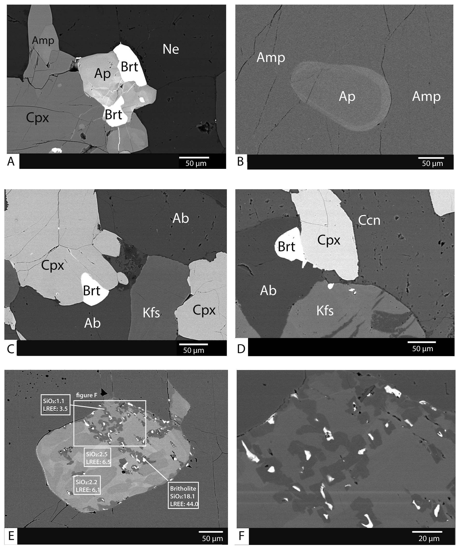 In the analyzed syenites, apatite crystals occur in grain sizes of up to ~450 µm (Figs. 5A, 5B ,6). They are classified as fluorapatites with 0.6-0.7 apfu F (Fig. 7A) and are characterized by high SrO2 (0.19-0.51 wt%) and Y2O3 (0.03-0.51 wt%) concentrations (Table 1). Apatite grains occur independently (Fig. 5B), rimmed by fluorbritholite (Fig. 5A) or in complex intergrowth with britholite (Figs. 5E, F, 6). Britholite occurs as fluorbritholite-Ce with 1-1.2 apfu Ce and 0.5-0.7 apfu F, discarding a possible inaccuracy of F contents due to beam migration. Electron microscopy and EPMA analyses reveal a complex growth history for the larger apatites (Fig. 6; Table 1). BSE images display several small grains, with very low SiO2 and high light REE concentrations, overgrown by a later generation of merged apatites with slightly higher SiO2 and light REE concentrations (Fig. 5E). These grains then underwent transformation, forming a third apatite and britholite generation by the reaction: