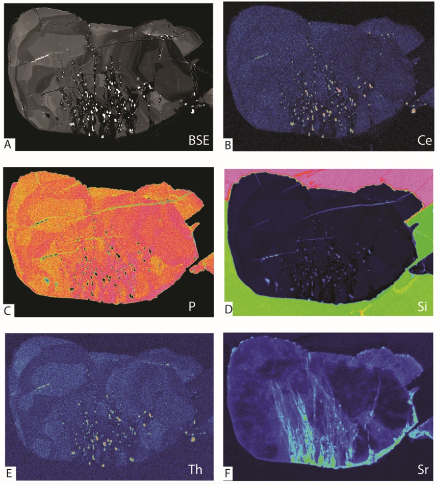 Fig. 6. BSE image and element distribution maps in an SJGS apatite crystal and delineation of britholite-rich domains: A. Exsolution of britholite (light colors), comparable to figure 5E. B. Britholite can be identified by its higher light REE concentrations, here exemplified by Ce. C-D. Apatite and britholite are easily distinguishable by their different P and Si concentrations. E. Higher Th concentrations can help differentiate britholite from apatite. F. Sr map indicating the metasomatic ingress of Sr into the britholite-bearing zone. Sample LC 1 (all images). Horizontal side of the image: 400 µm.