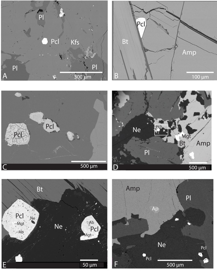 Sodalite is restricted to a few samples (LC 2 and UNG 1762) and in low concentration. It forms anhedral to euhedral grains with a maximum grain size of ~0.8 mm (Fig. 3C). It contains up to 10 wt% Cl (Supplementary Table S2). It commonly has inclusions of euhedral pyrochlore.