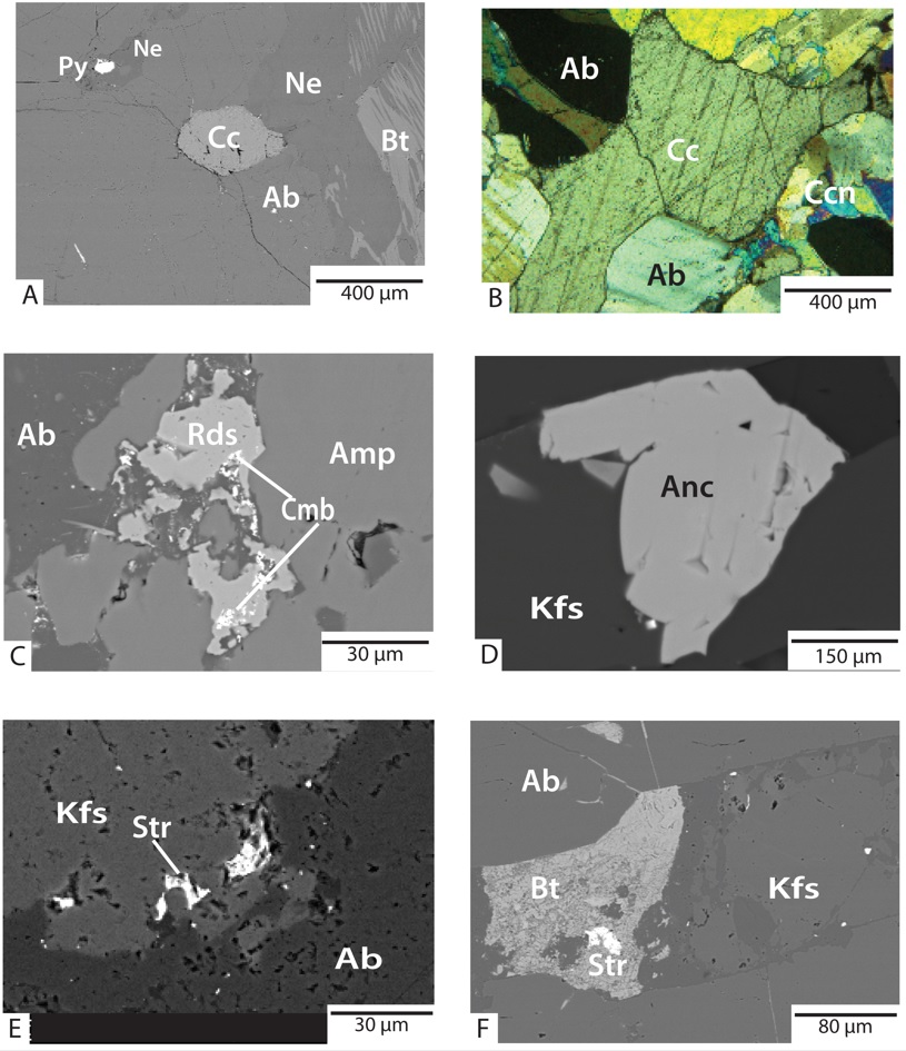 Albite (Ab94-99 An0.3-6 Or0.4-0.5; Supplementary Table S1) occurs as corona (rims) around nepheline (Fig. 3D) and in Kfs or as individual grains (Fig. 3A, 3E, 4A-D), commonly in contact with nepheline, clinopyroxene, microcline, amphibole, and locally with primary calcite (Fig. 3A).