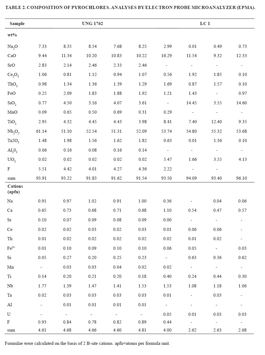 The analyzed pyrochlores are characterized by Nb+Ta > 2Ti and Nb > Ta (Table 2), being therefore pyrochlores following the classification of Hogarth (1977). The general formula of the pyrochlore supergroup is A2B2X6Y, where the A site contains the large Na, Ca, Mn, Sr, Y, and REE cations in 8-fold coordination, and the B site contains the smaller 6-fold coordinated Ta, Nb, Ti, Fe3+, Mg, Al, and Si.