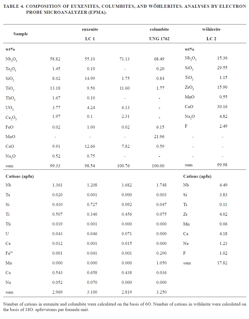 Euxenite occurs in sample LC 1 as a <50 µm-long euhedral inclusion in nepheline. It contains up to 4.2 wt% UO2 and 2.3 wt% Ce2O3 (Table 4). The presence of euxenite as an inclusion in nepheline indicates an early crystallization in the magmatic evolution.