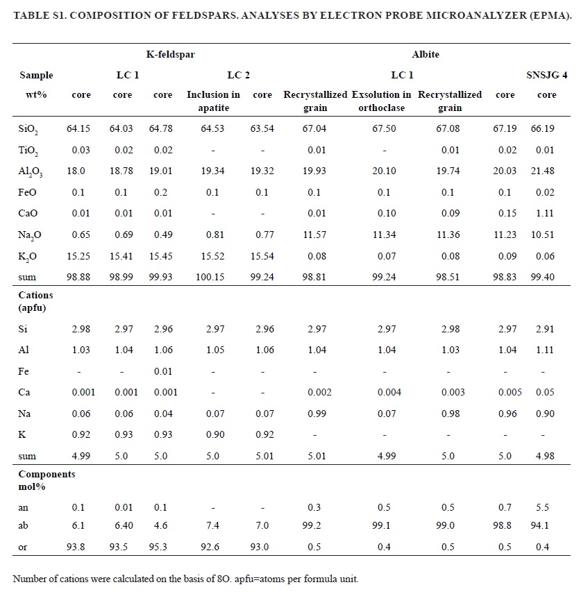 All rocks are hololeucocratic to leucocratic with colors that vary from white to gray. They are massive and phaneritic. In general, crystal sizes range from <1 mm to 4.5 mm but some samples present a coarser-grained and inequigranular texture. Samples SNSJG 2, LC 1, and LC 2 (see figure 2 for locations) show alkali feldspar tabular crystals of up to ~2 cm. Some samples (SNSJG 4 and 5a from El Capricho and LC 1 and LC 2 from Las Delicias) display an inequigranular texture with oriented alkali feldspar phenocrysts (up to 1.5 cm), suggesting a sub-solidus magmatic flow orientation in a stress field (see Stein, 2000).