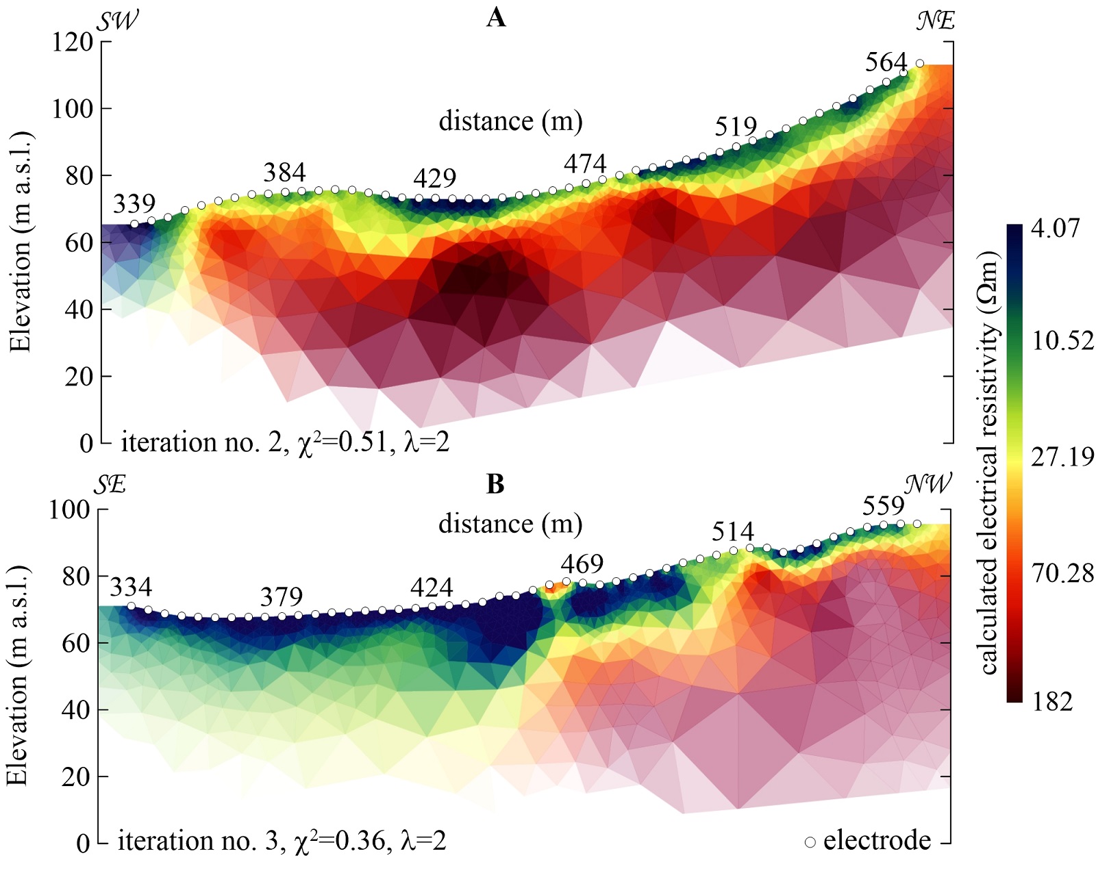 Over the past few decades, the development of sophisticated electronic and computerized systems has led to significant progress in geophysical data recording devices. Our study used a Syscal R1 Plus Switch-48 for resistivity profiling. This instrument consists of two multi-cable systems of 24 channels, each with a maximum distance between the electrodes of 5 m. For carrying out the automatic switching of these electrodes and acquiring profiling data, two parameters were set: (i) acquisition parameters, which include the minimum and maximum number of stacks per measure (in this study, 3 and 6 respectively), the quality value (or minimum standard deviation) of the voltage and electrical current ratio for the stacks (1%), and the time cycle (500 ms); and (ii) geometrical parameters, such as the number of electrodes (48), electrode distance (5 m), number of levels (23), and electrode array (Wenner-Schlumberger). Regarding the electrode array, it was considered a suitable option for achieving both good and vertical resolutions (e.g., Loke, 20213).