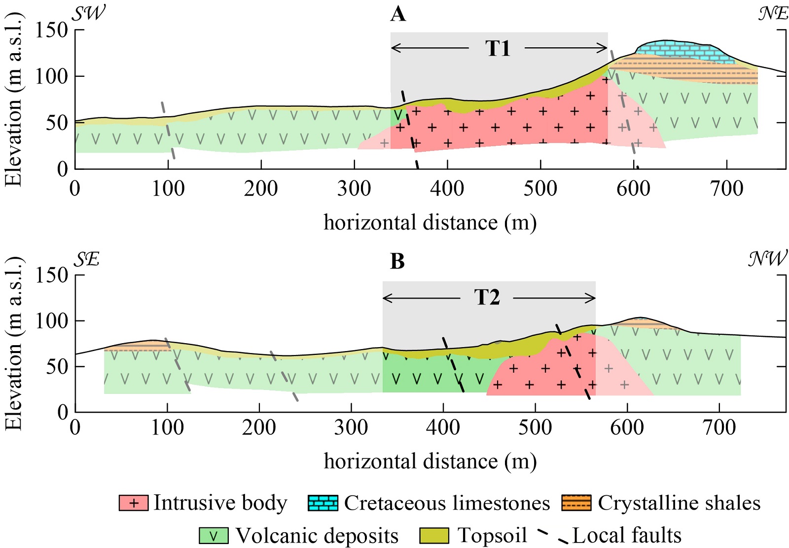 The inverted resistivity images obtained above were combined with the surface geological information reported by Ruiz (2018, 2020) to create geological sections along the profiles P1 and P2 (Fig. 4).