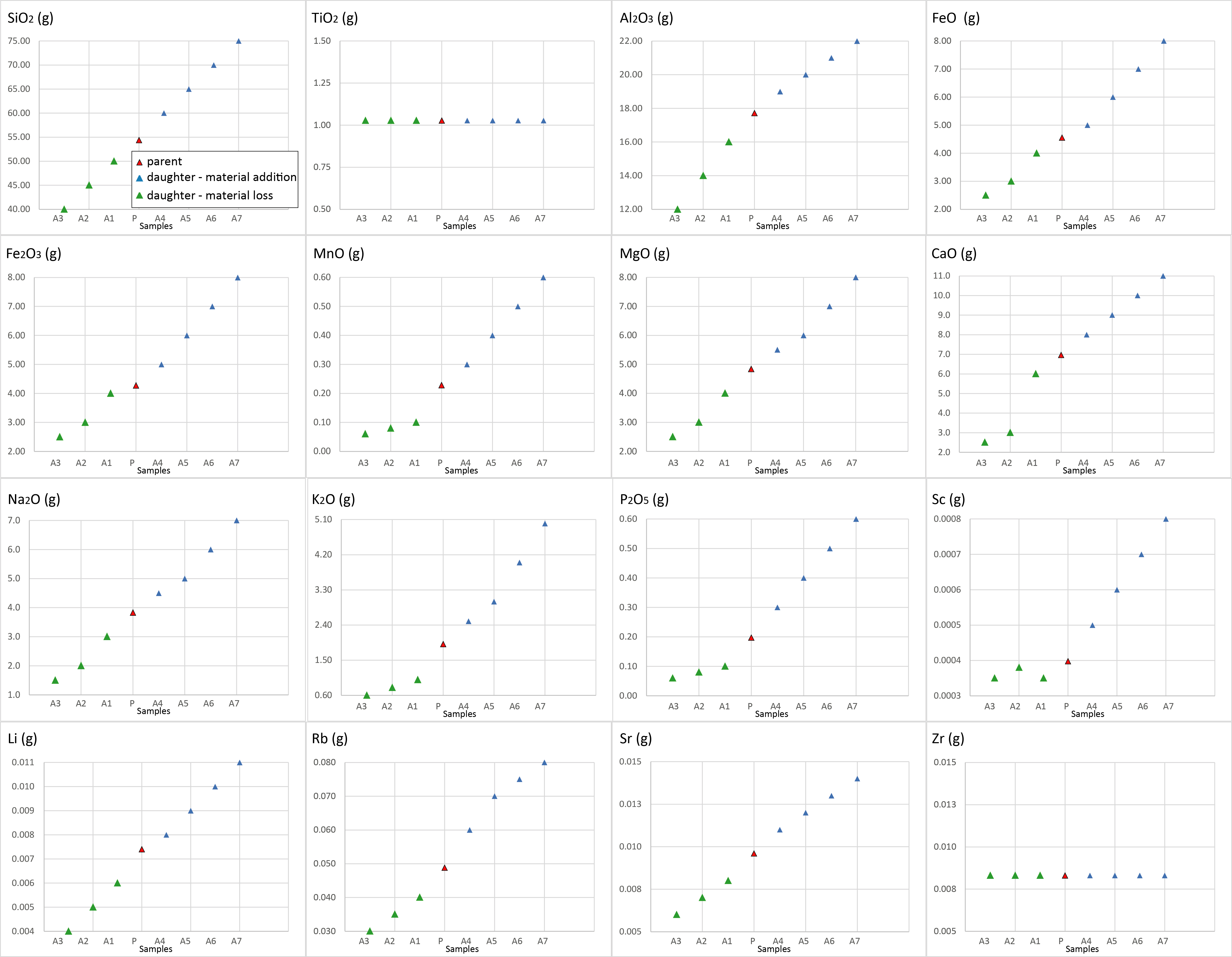 Fig. 1. Masses of major oxide and trace elements for the numerically generated dataset. Red triangle: parent sample. Green triangles: daughter samples that lost mass relative to the parent sample. Blue triangles: daughter samples that gained mass relative to the parent sample. See table 1 for calculation details.