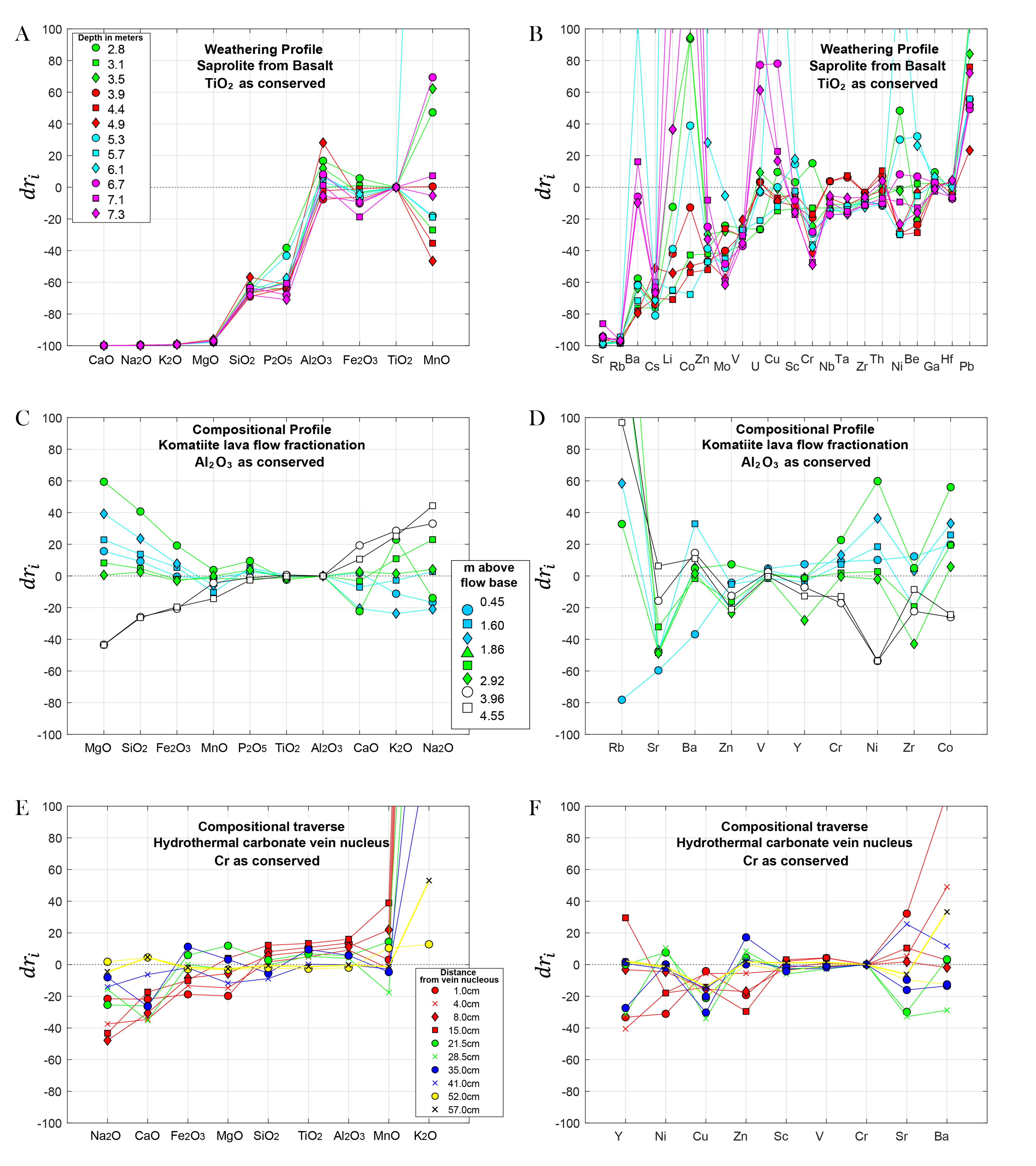 Fig. 5. Relative material transfer percentages for the real-case datasets, considering TiO2, Al2O3, and Cr as conserved elements (see text for explanation). Left panels show major elements. Right panels indicate trace elements. A-B. Soil depth (in meters) from a saprolite weathering profile (parent material: basalt) (Jiang et al., 2018). C-D. Different levels (reported as meters above base) in komatiitic lava flow (Shore, 1996). E-F. Traverse (in centimetres) along a hydrothermal carbonate vein nucleus (Mori et al., 2003). See Supplementary material 2 for calculation details.