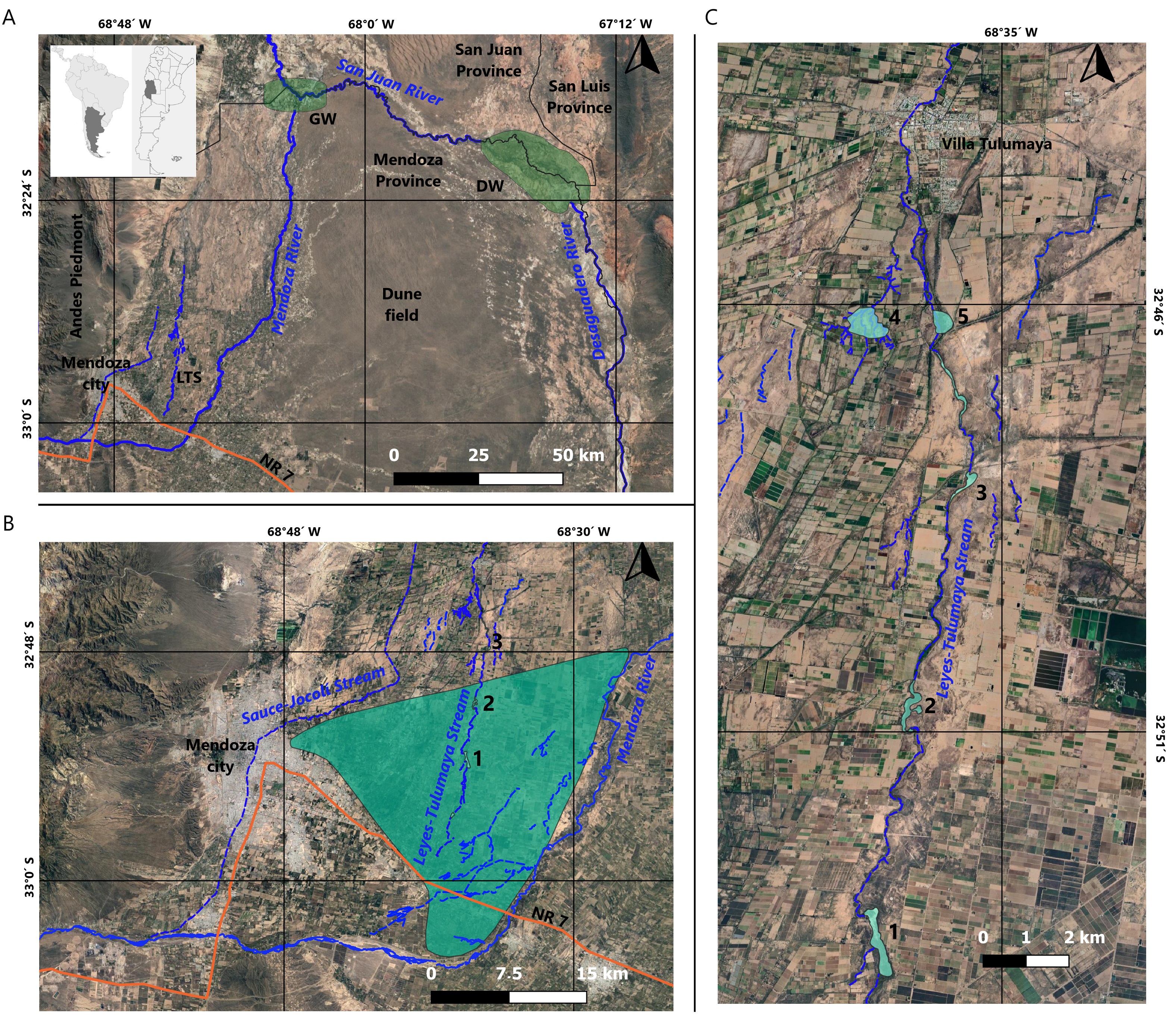 The lakes of the Leyes-Tulumaya system are located in the fluvial-alluvial plain of the Mendoza River at the Andes piedmont (Fig. 1A). This extensive geomorphological unit is limited to the south by the current course of the Mendoza River, to the north by the Lagunas de Guanacache wetland, which is where the Mendoza and San Juan rivers merge, and to the east by the large sandy fluvial-aeolian plains of the Desaguadero River (Sepúlveda, 2001; Devincenzi et al., 2015) (Fig. 1A). The sedimentary infill of this fluvial-alluvial plain is the result of the erosion of different lithologies that crop out in the mountain (western) areas of the upper Mendoza River Basin (González Díaz and Fauqué, 1993; Sepúlveda, 2001). In the Late Cenozoic, tectonic subsidence favored a large accumulation of sediments that reaches a current maximum thickness of up to 600 m (Rodríguez and Barton, 1993; Sepúlveda, 2001). This basin configuration was apparently structurally controlled by a submeridional fault system that would have conditioned the current disposition of the Mendoza riverbed (Zambrano, 1978).