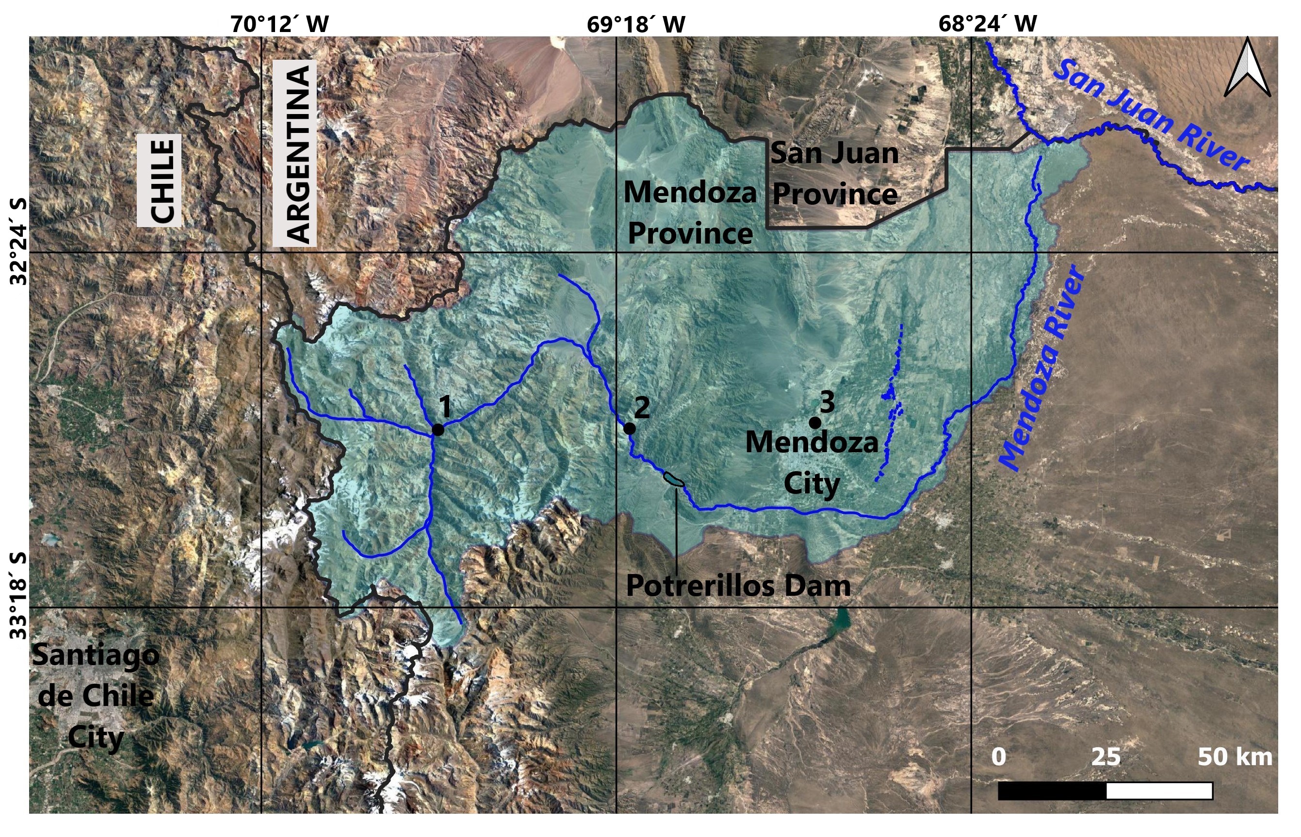 The mean annual and monthly streamflows of the Mendoza River were obtained from the National Water Institute (INA by its acronym in Spanish). Only gauge stations upstream the Potrerillos Dam were chosen: Punta de Vacas (32°45’ S/69°50’ W, 2,380 m a.s.l.; series 1949-2021), and Guido (32°50’ S/69°16’ W, 1,540 m a.s.l.; series 1956-2021) (see gauge locations in Fig. 2). The selection of upstream gauge stations only was due to the limited data from gauge stations downstream the Potrerillos Dam since the discharges are immediately deviated for hydroelectric and irrigation purposes.