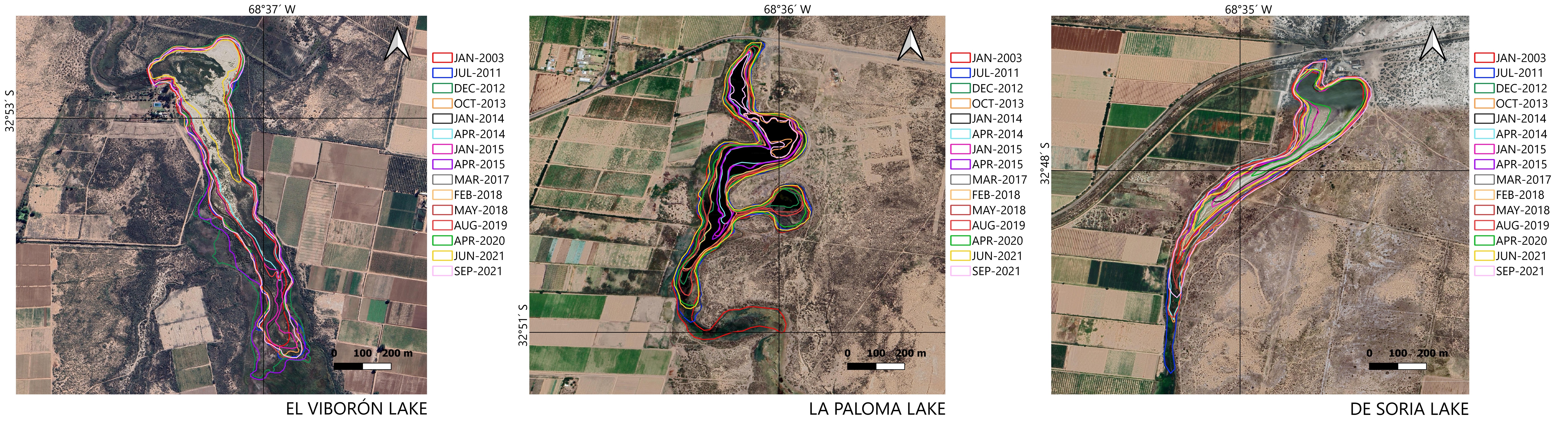 The lake area changes along the Leyes-Tulumaya system reveal a similar evolution although at different rates (Fig. 4). The El Viborón lake, elongated in a north-south direction, reached a maximum extent in July 2011 (~280,000 m2) and a minimum in June 2021 (~70,000 m2) (Figs. 4 and 5; Table 1). This lake showed area variations of 40% at the beginning of the record up to 75% at the end of the period analyzed. After a transient recovery in September 2021, this lake dried up in May 2022. The La Paloma lake, characterized by a meandering shape (Fig. 4), had its maximum area in January 2003 (~180,000 m2) while its minimum was recorded in January 2014 (~12,000 m2) (Figs. 4 and 5; Table 1). This lake showed area variations close to 90% (Fig. 5). The De Soria lake, the northernmost of the three, reached its largest surface area in July 2011 (~135,000 m2) and its smallest in April 2020 (~40,000 m2) (Figs. 4 and 5; Table 1). Water area variations of up to 70% were determined (Fig. 5).