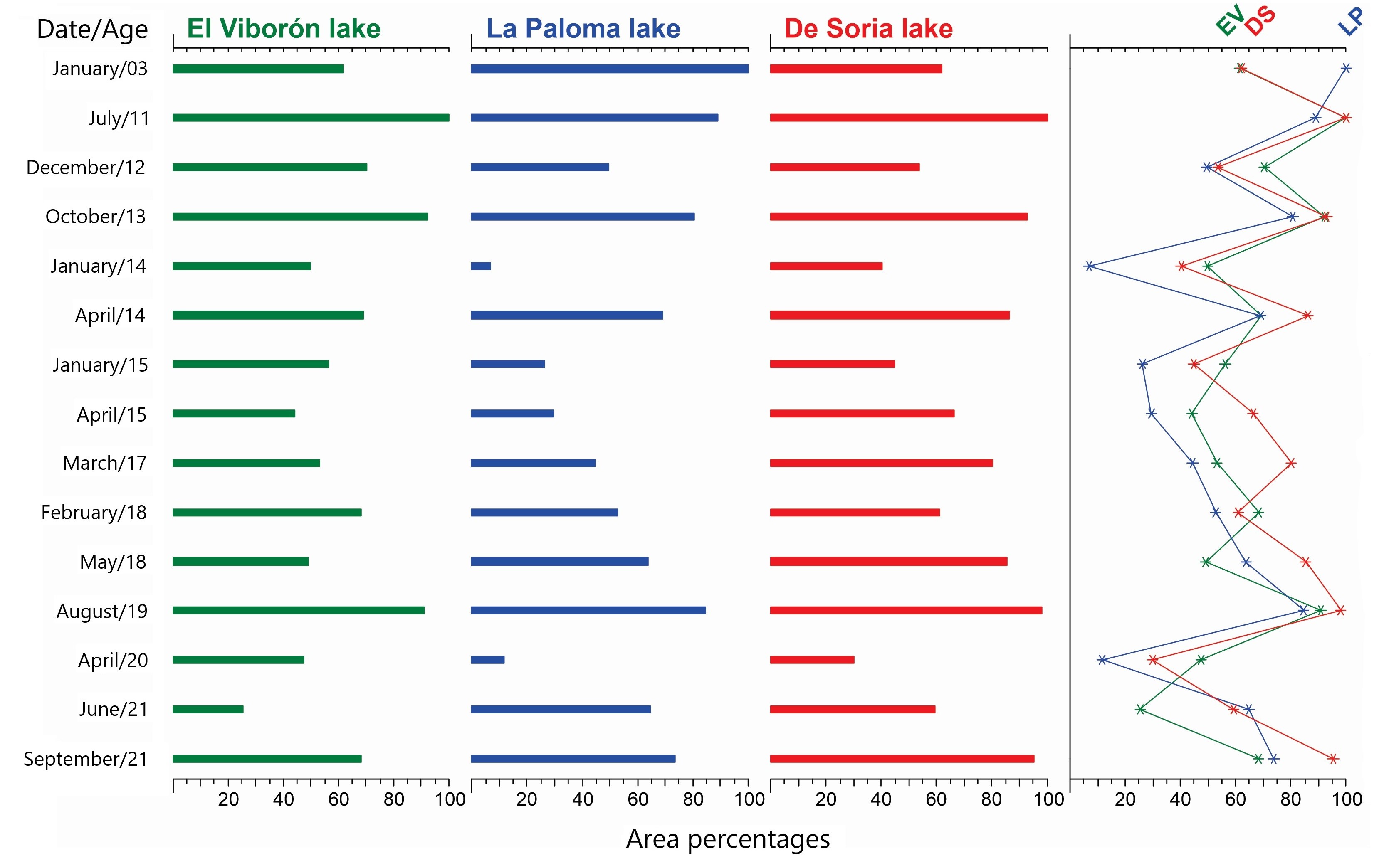 The surface extent of the Leyes-Tulumaya system lakes El Viborón, La Paloma, and De Soria were calculated for the period 2003-2021 by loading the satellite images on QGIS (Supplementary Table S1). The temporal surface evolution of each individual lake was analyzed by using 65 images. For each lake, the measured areas were transformed into percentages based on the maximum area recorded during the timespan analyzed and compared across lakes only for data captured at the same time (Figs. 4 and 5). Yearly averages for the years 2003, 2011-15, and 2017-21 were obtained. By May 2022, the El Viborón lake was already fully desiccated and colonized by halophyte plants, as observed during field trip activities.