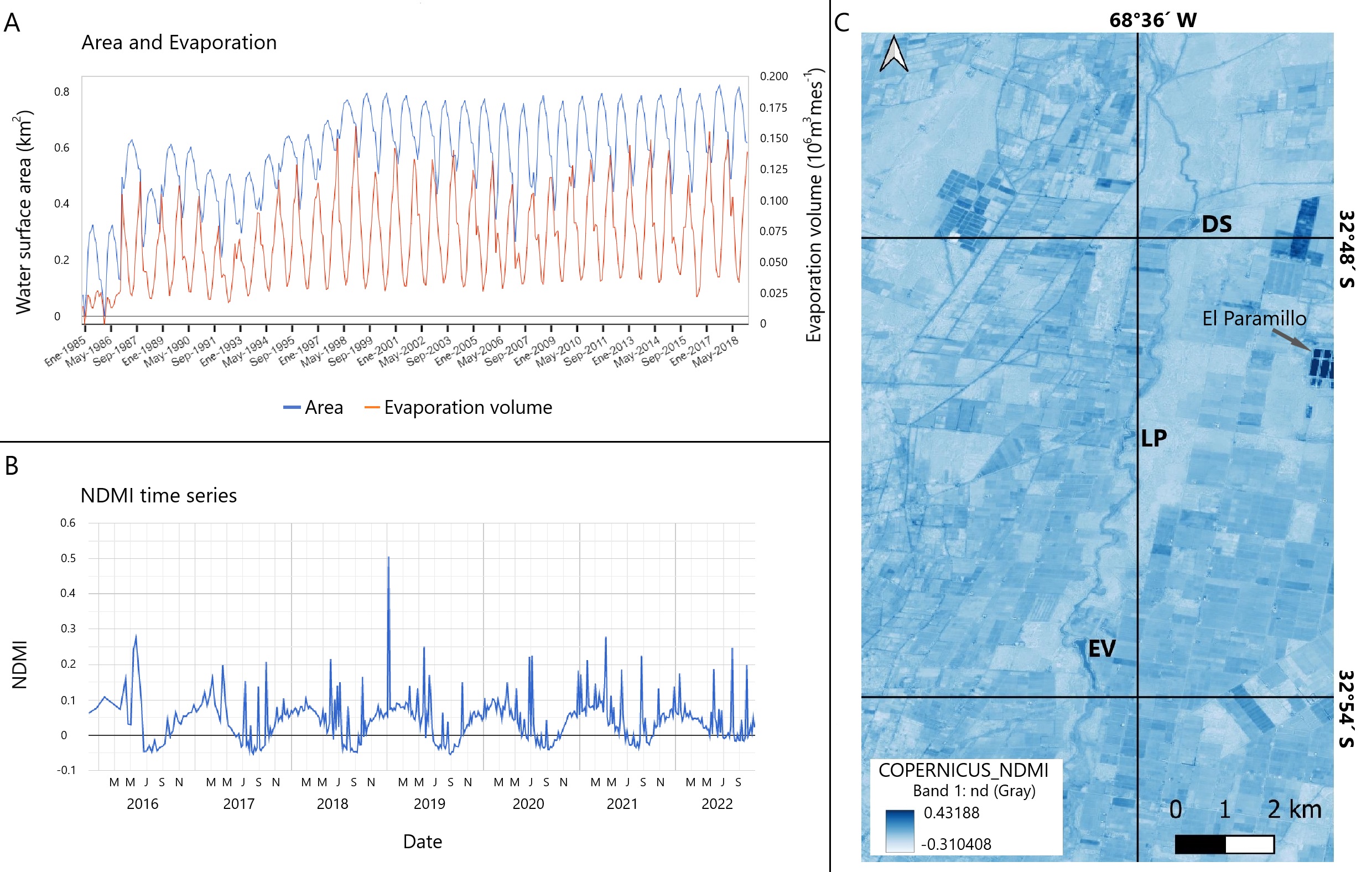 The Global Lake Evaporation Volume (GLEV) dataset, which provides surface area and evaporation volumes for more than a million lakes and water reservoirs worldwide (Zhao et al., 2022), does not include information about the Leyes-Tulumaya lakes. To remedy this, in the present study an artificial water body associated with a sewage treatment plant (El Paramillo Wastewater Treatment Plant), close to the Leyes-Tulumaya system (32°50’ S/68°33’ W) was analyzed in Google Earth Engine. Data for this artificial reservoir were taken from the GLEV dataset as well, thus providing useful monthly information for the period 1985-2018. As for the vegetation and soil water contents, they were calculated by using the Normalized Differential Moisture Index (NDMI) by means of Sentinel-2 MSI Level-1C imagery (spatial resolution of 10 m in band B8 and 20 m in band B11) with Google Earth Engine for the 2016-2022 period (satellite data only available for this period). The NDMI was calculated by comparing bands 8 and 11 for each pixel during the analyzed period by keeping the coarser resolution (Strashok et al., 2022). NDMI values were also obtained for a specific area and plotted over time, highlighting the inter-annual variations of the index.