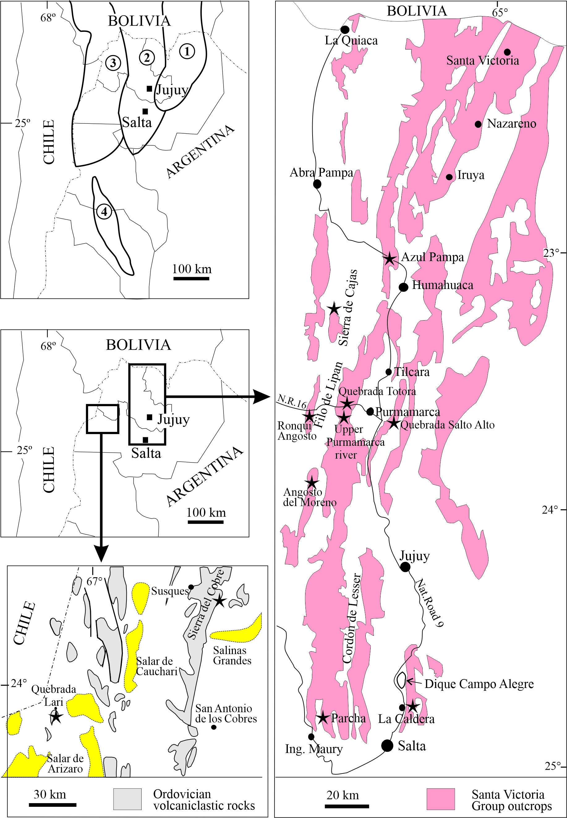Lower Paleozoic rocks in northwestern Argentina and southwestern Bolivia are superbly exposed in the vast Central Andean basin encompassing the Eastern Cordillera and the Subandean Ranges (e.g., Astini, 2003; Waisfeld et al., 2023) (Fig. 1). The Puna-Famatina magmatic arc developed to the west is characterized by thick volcanic and sedimentary successions (Coira et al., 1999). In northern Chile, to the south of Salar de Atacama, there are also extensive outcrops of Ordovician volcanic, intrusive, and sedimentary rocks (Niemeyer, 1989).