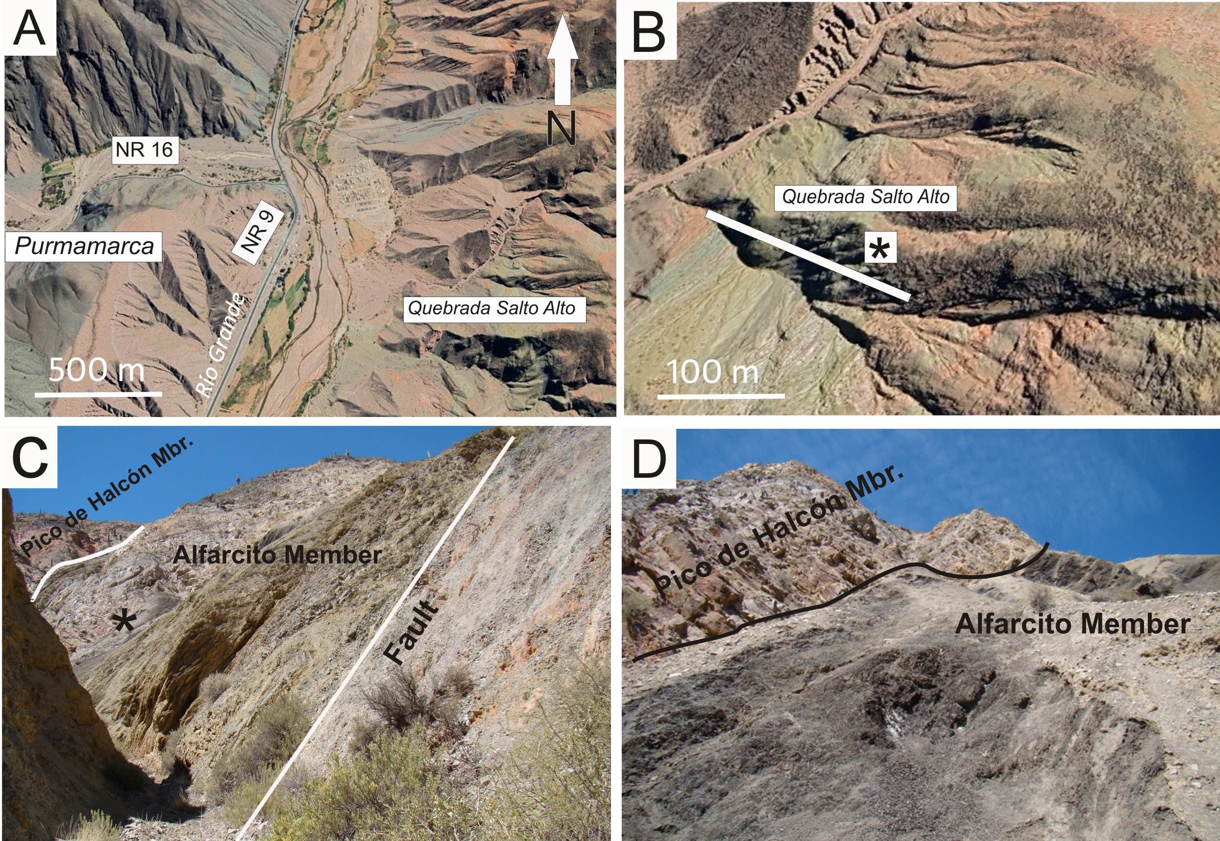 Fig. 2. A. Satellite general view of the study area (see Fig. 1 for a general location). B. Zoom-in excerpt into the Quebrada Salto Alto showing the stratigraphic section (white line) and fossiliferous beds location (black asterisk). C. Headwaters of the Quebrada Salto Alto toward the east, showing the Pico de Halcón and the Alfarcito members. Black asterisk indicates the location of the fossiliferous beds. D. Detail of the sharp contact between the Pico de Halcón and the Alfarcito members (note that the succession is overturned). In the foreground, fossiliferous black shales with calcareous concretions yielding Kvania lariensis and Jujuyaspis keideli.