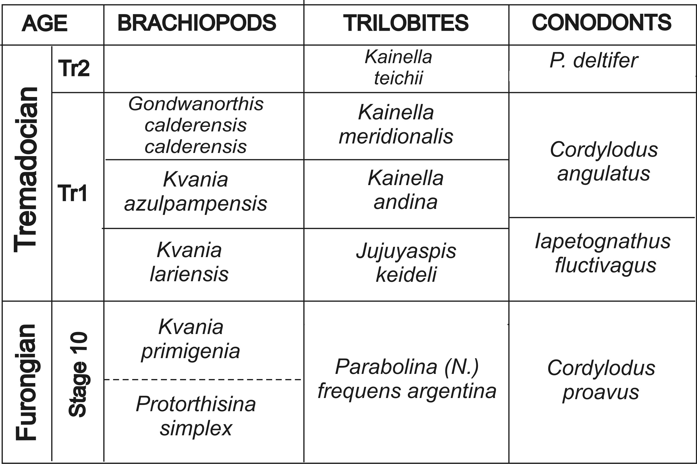Based on the previously exposed phylogenetic evidence, two other phylozones can be recognized within the time slice Tr1 (Bergström et al., 2009), the Kvania azulpampensis and the Gondwanorthis calderensis calderensis biozones. As figure 3 shows, they are almost equivalent to the Kainella andina and Kainella meridionalis trilobite biozones (as redefined by Vaccari et al., 2010), respectively, and to the Cordylodus angulatus conodont Zone. These two phylozones are described below.