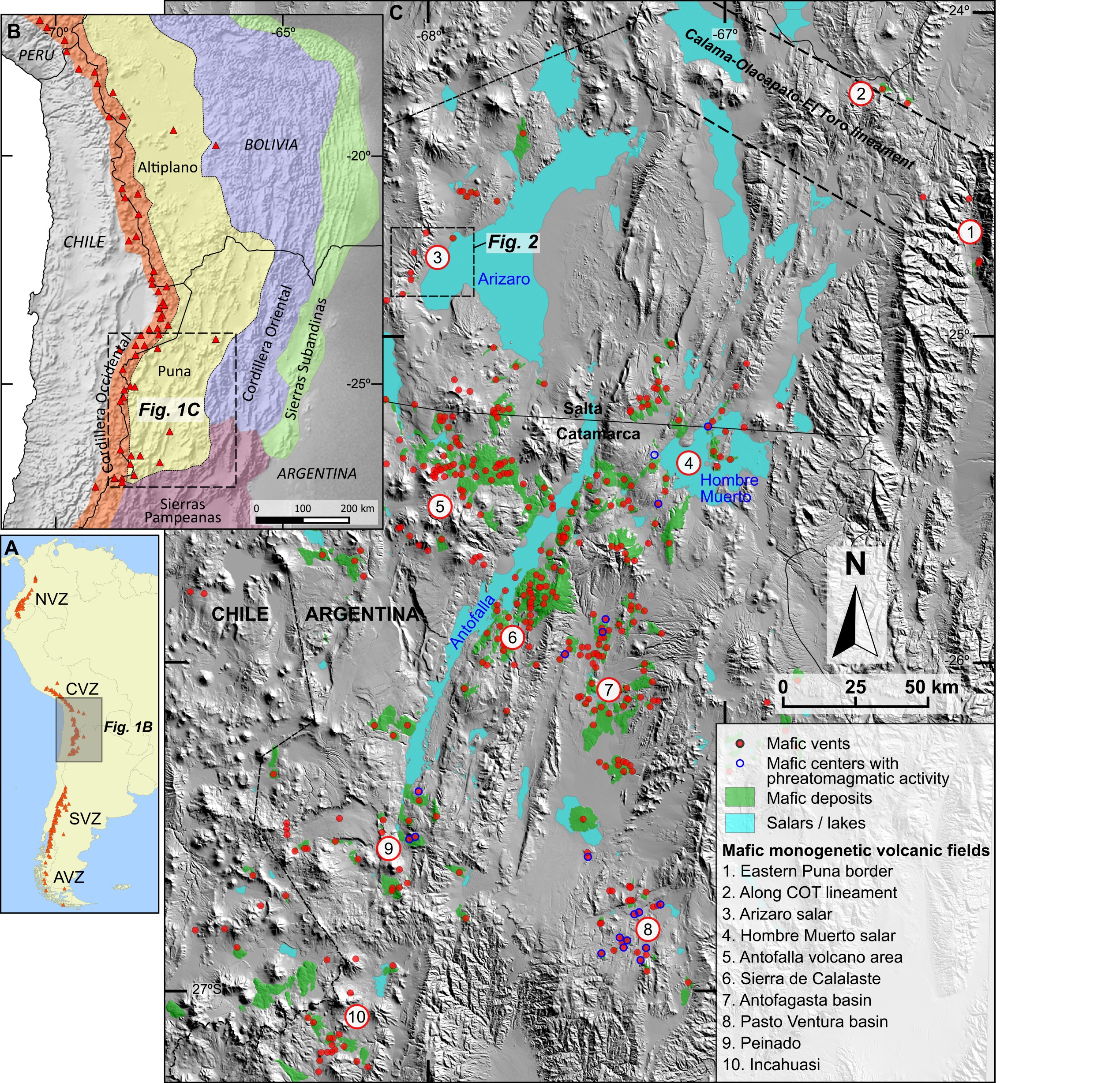 Monogenetic volcanism and salars converge in the Altiplano-Puna region of the Central Andes, which is part of the subduction-related Central Volcanic Zone of the Andes (e.g., Stern, 2004; Trumbull et al., 2006) (Fig. 1). The Altiplano (in Bolivia) and Puna (in Argentina) form a high-elevation and arid plateau containing abundant volcanic landforms and deposits, including hundreds of mafic monogenetic centers, and large endorheic basins that often host salars (e.g., Jordan et al., 1983; Alonso et al., 1991; Allmendinger et al., 1997).