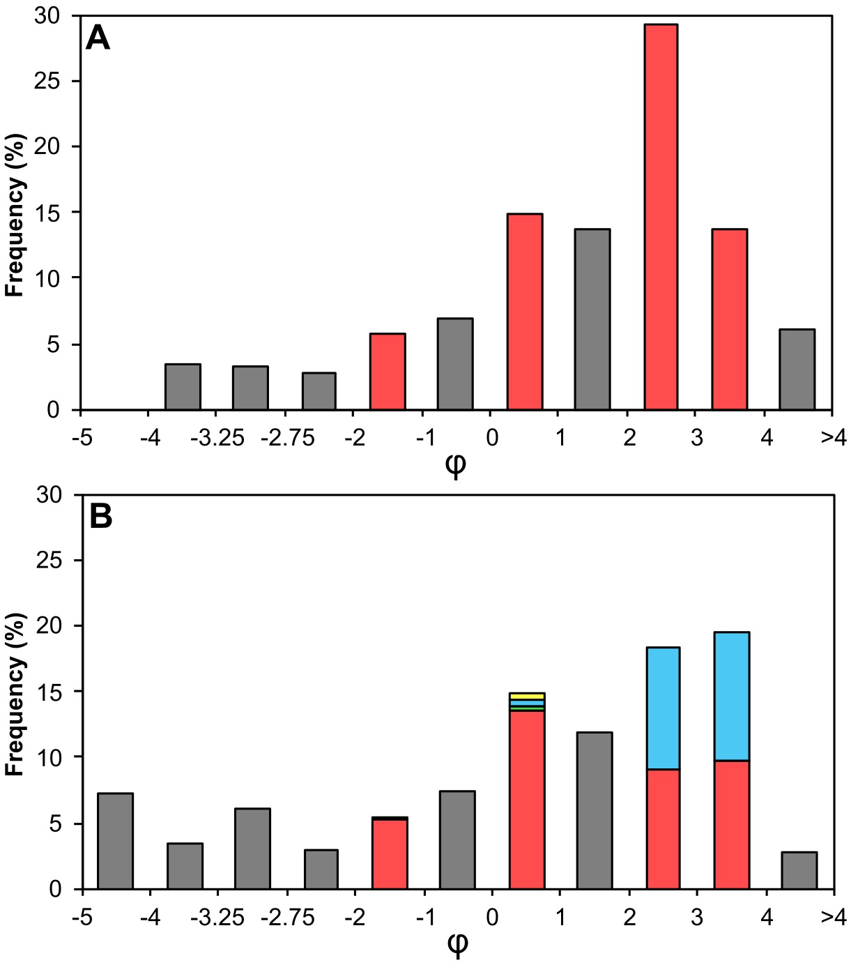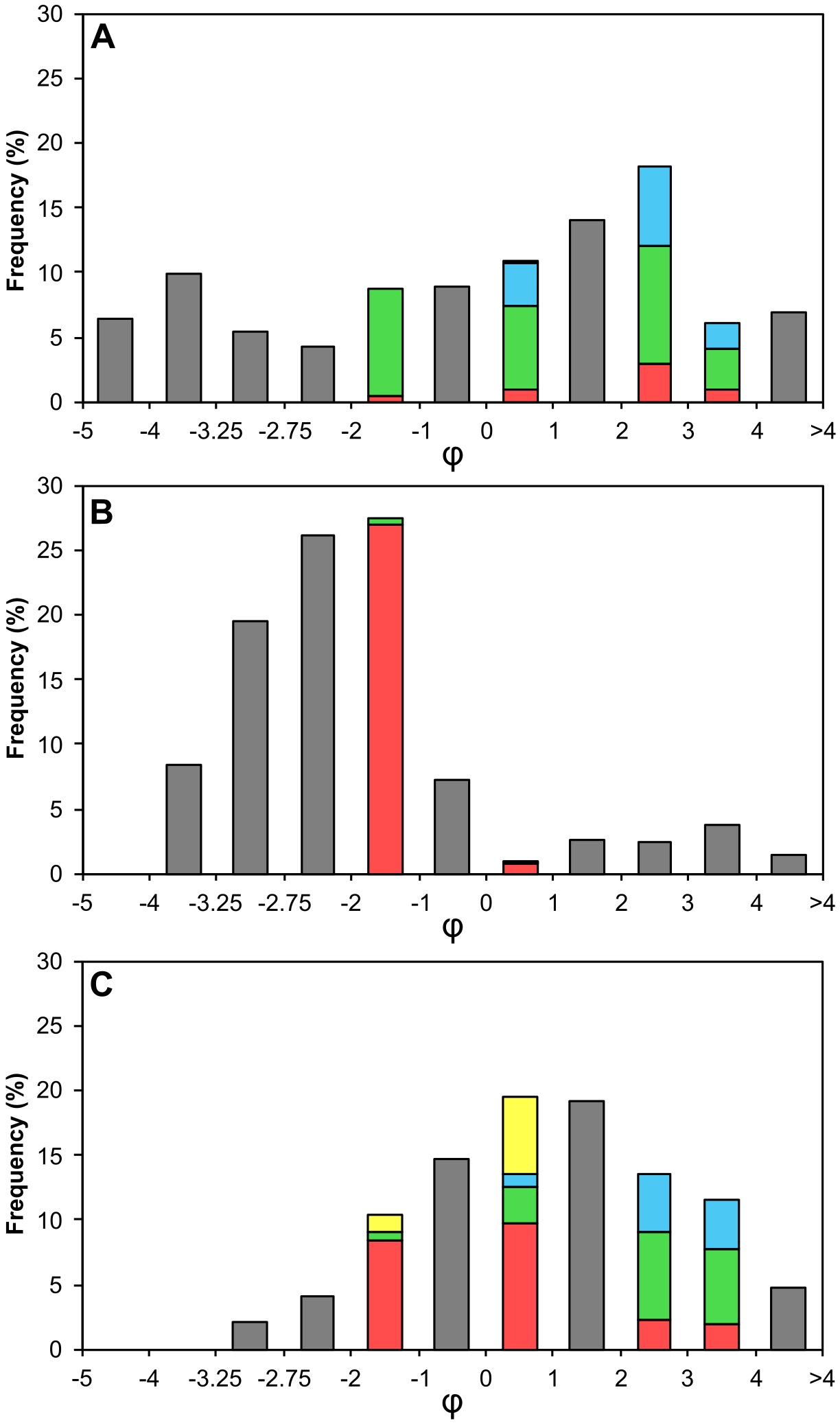 Size, roundness, vesicularity and componentry of the -2 to -1φ (4 to 2 mm), 0 to 1φ (1 to 0.5 mm), and 2 to 4φ (0.25 to 0.0625 mm) fractions of the five analyzed samples were estimated with a binocular lens. Roundness was defined following the traditional sedimentological classification proposed by Wadell (1933), which classifies fragments as very angular, angular, sub-angular, sub-rounded, rounded, and well rounded. Vesicularity was classified as low (<40 vol.%), moderate (40-60 vol.%), high (60-80 vol.%), and very high (>80 vol.%). For the componentry analysis, juvenile clasts, accidental lithic clasts, crystals and aggregates were recognized. Juvenile clasts were recognized as clasts of lava or scoria of mafic composition. Accidental lithic clasts were sub-divided into sedimentary (fragments of sedimentary rocks), metamorphic (phyllites), plutonic (fragments of granite, diorite or syenite rocks), and volcanic (fragments of andesite, dacite or rhyolite rocks). Volcanic lithic clasts and juvenile clasts were differentiated based on their contrasting compositions (juveniles more mafic, volcanic lithics more felsic). The abundance of each component was estimated by particle counting (200-300 particles per size fraction).
