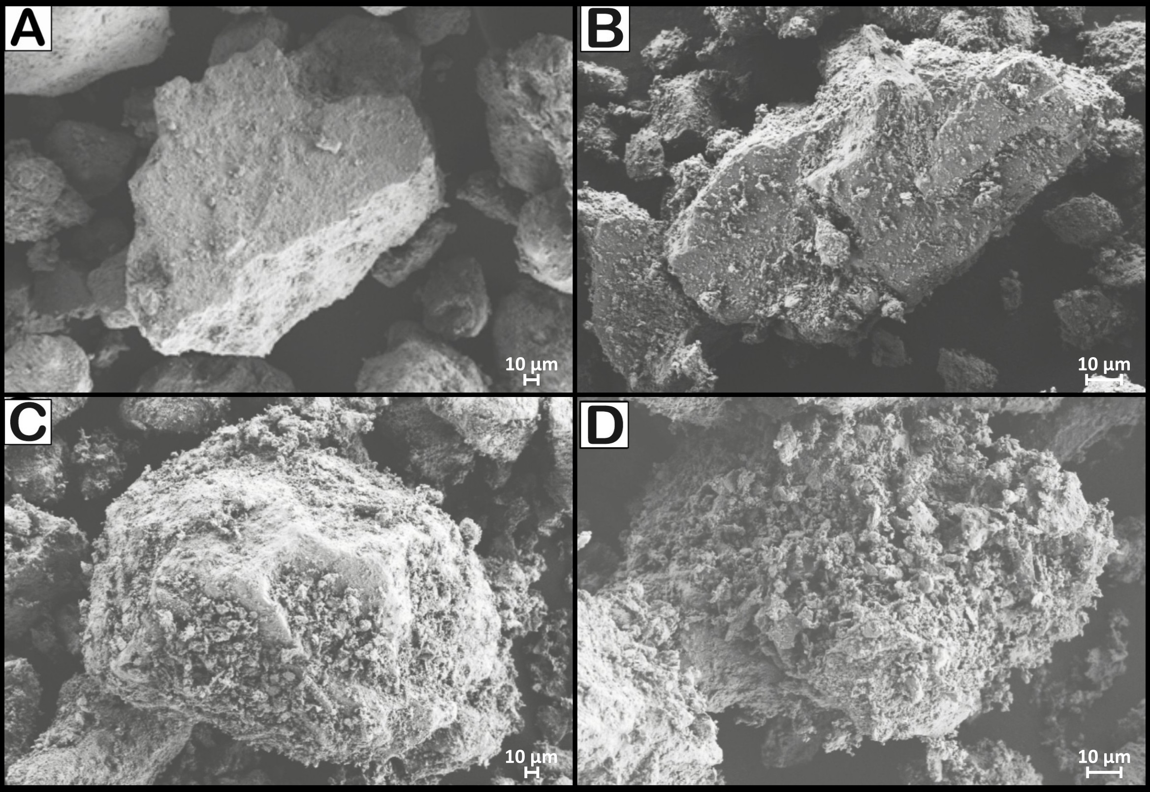 Figure 7 shows SEM images of the fine to very fine ash fractions. Clasts are mostly poorly vesiculated and have blocky morphologies. They generally show rugged and irregular surfaces, and sub-angular, dented or concave-convex edges. Some clasts have step-like surfaces and moss-like aggregates are also found. Clasts are often covered by smaller particles adhered to their surfaces.
